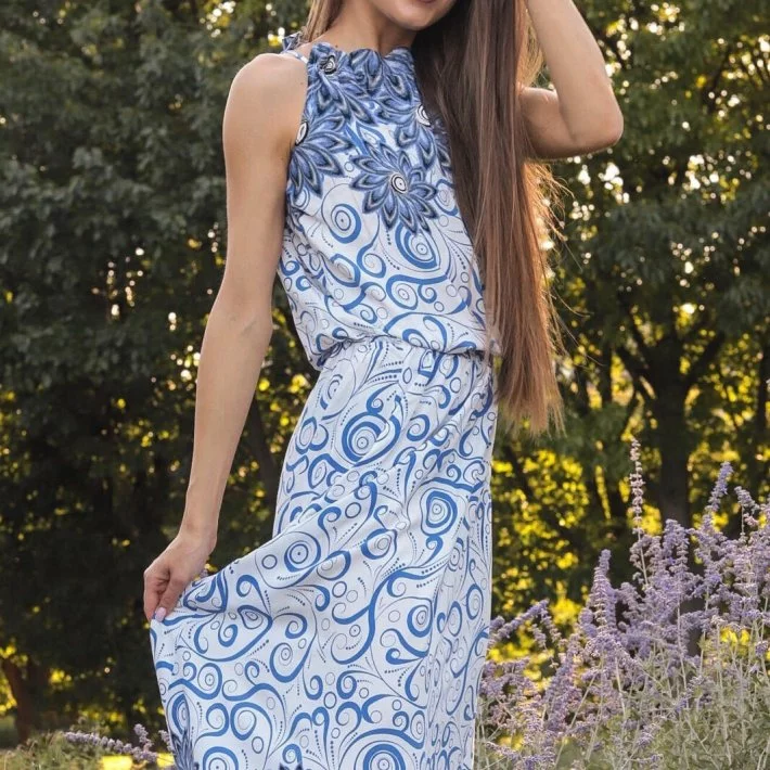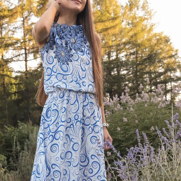 Сукня з яскравого натурального штапелю. По лінії талії пришита