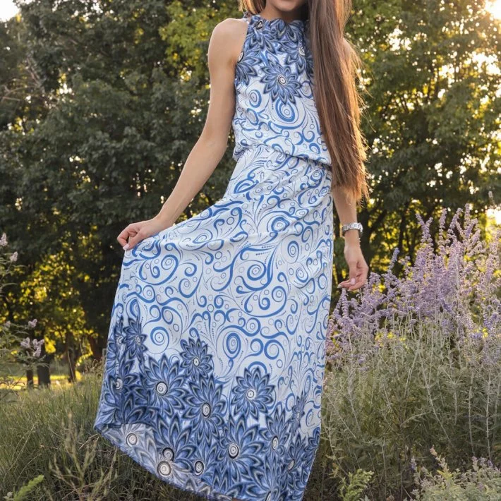 резинка, верхня частина сукні трохи з напуском. Позаду по горловині