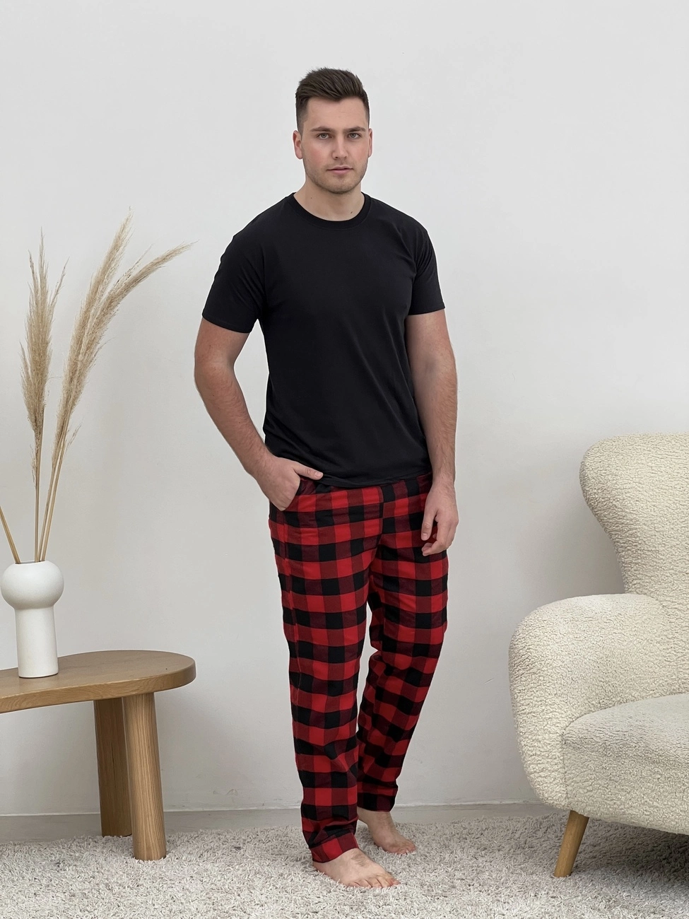 Затишні фланелеві штани з кишенями.  Пояс на резинці з регульованою куліскою.  Штани: Колір: клітина червоно/чорна. Тканина фланель: бавовна 70%, поліестер 30%, Туреччина  Щільність: 160 г/м2 Ефект: легке начісування, одностороннє (всередину)  Чоловіча футболка- 100% бавовна Колір: чорний (f02) Размер: L; XL; M; 2XL