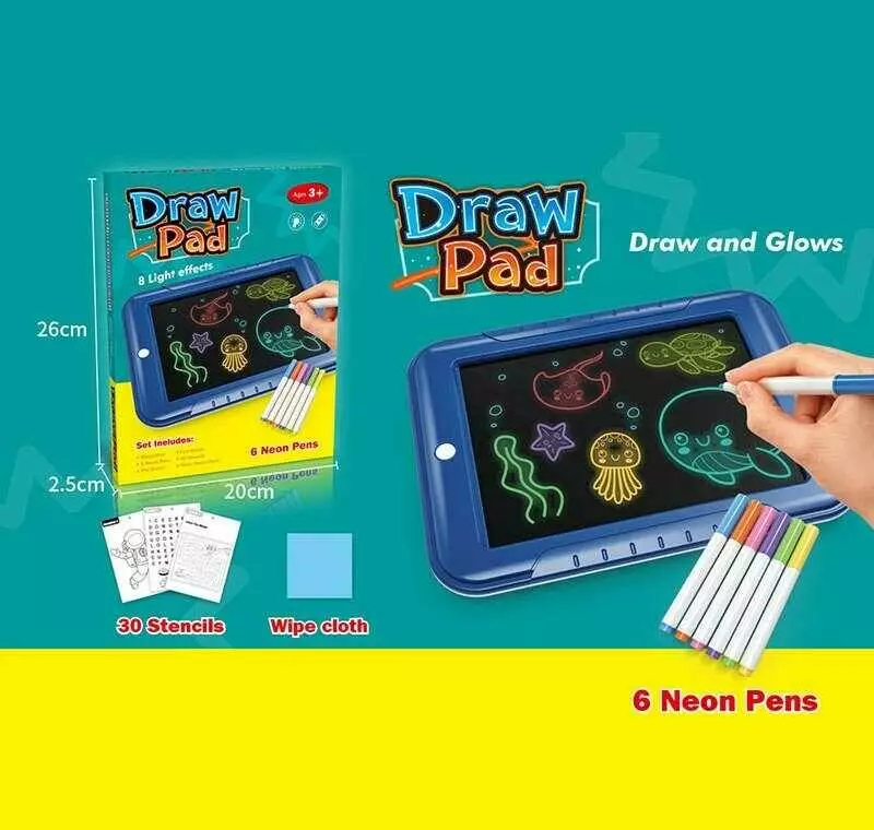 Головна > Каталог > Дошка для малювання 1688 Y (120/2) різнокольорове LED - підсвічування, 6 неонових маркерів, прозора основа, фон, серветка, в коробці оптом
