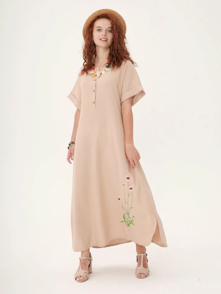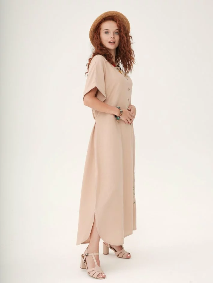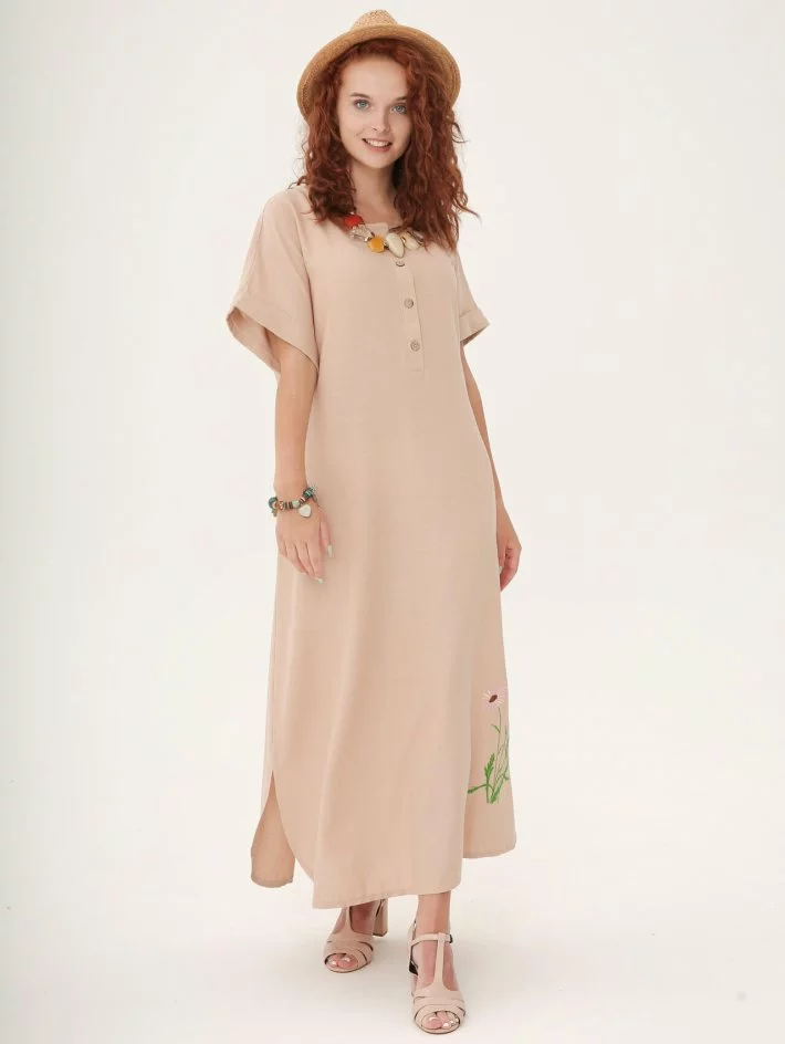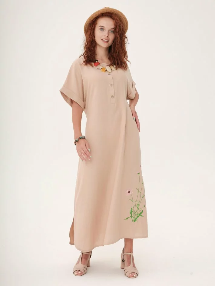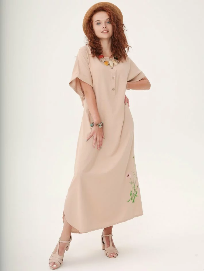 Сукня виконана з натурального льону з гудзиками попереду. По лінії