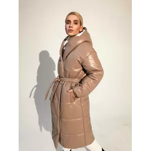 Довга жіноча зимова куртка - пуховик ZEFIR з екошкіри класу Lux на силіконі 200 з капюшоном бежевого кольору
