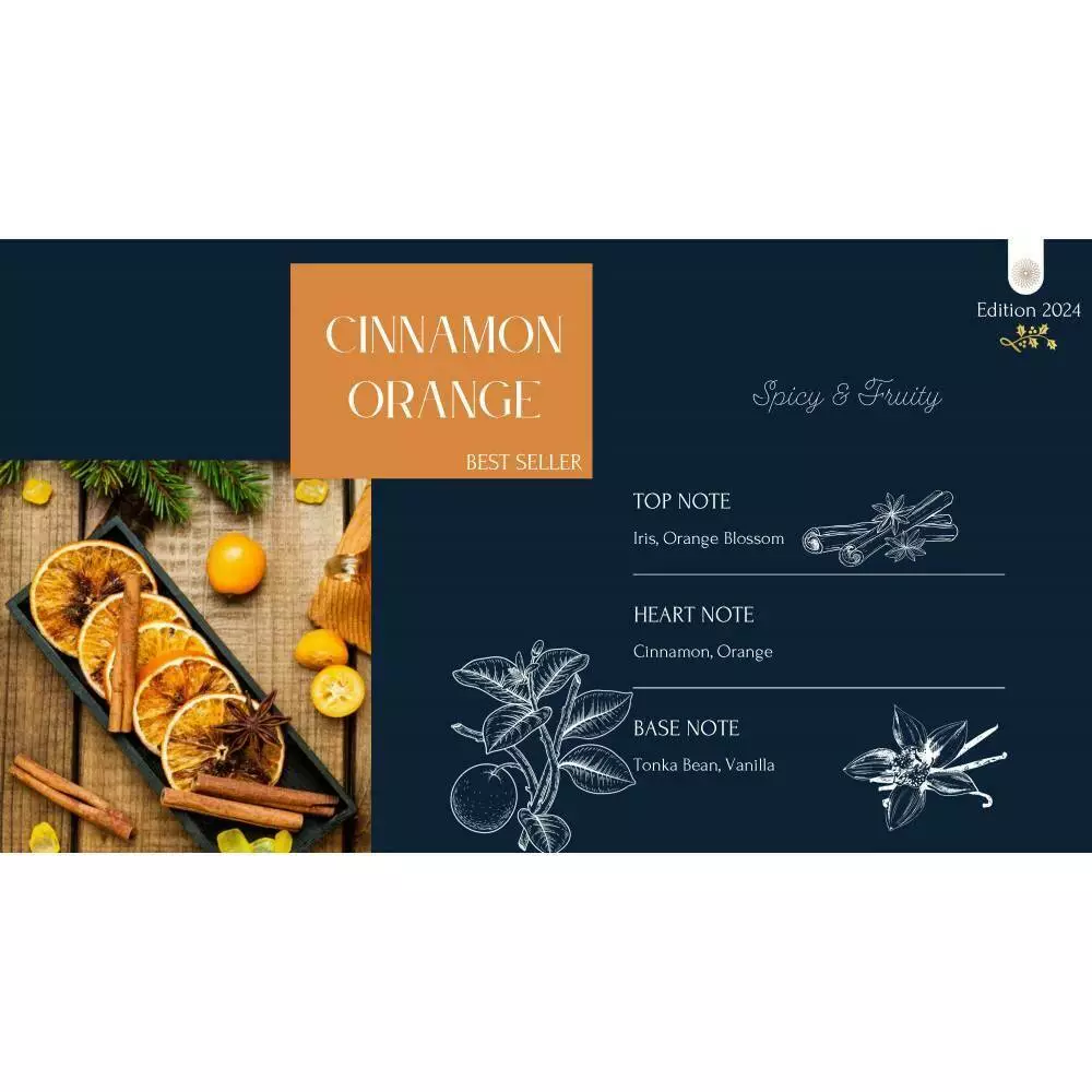 Средние ноты корицы и апельсина добавляют аромату насыщенного пряного тепла и цитрусовой яркости, напоминающей любимые зимние напитки и выпечку.