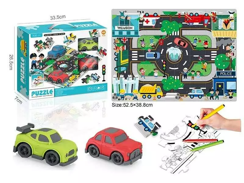 Двосторонній пазл 7077-104 (48/2) “Іграшкове місто”, 48 елементів, розфарбовка, 2 машинки, пазл 52х39 см, в коробці