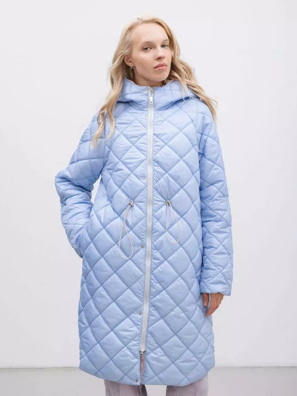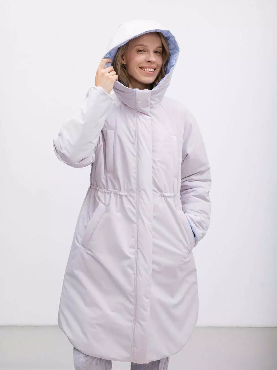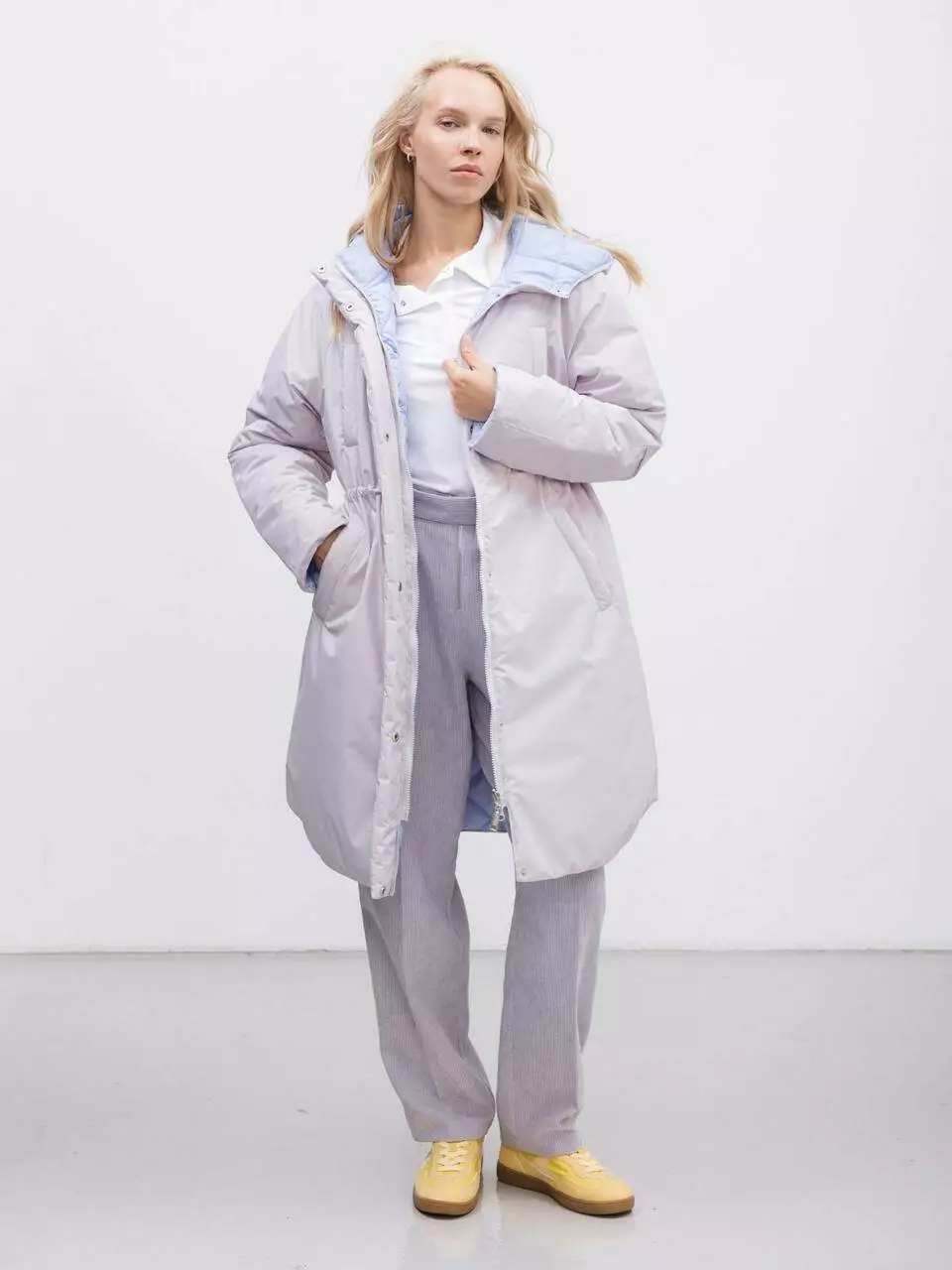 Представляємо нашу вишукану двосторонню подовжену парку, яка поєднує в собі стиль і функціональність. З одного боку вона виконана з водонепроникної тканини ніжно-лілового кольору, що забезпечує надійний захист від дощу та вітру. З іншого боку — стьобана підкладка світло-блакитного кольору, яка додає яскравого акценту вашому образу.