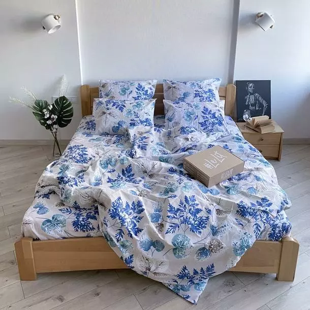 Двуспальное постельное белье LeLIT 0834 бежево-голубое с принтом "Листва"
