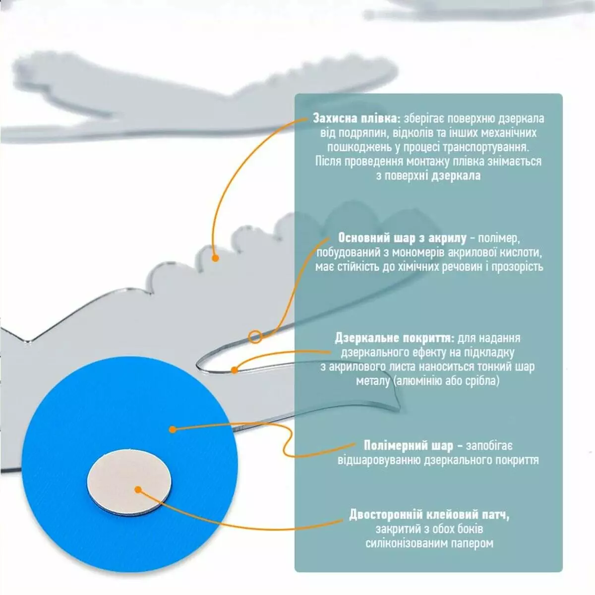• Дзеркальний шар: це тонке металізоване або полімерне покриття, яке наноситься на акрилову основу та створює ефект дзеркального відбиття. Воно має гладку, світловідбивну поверхню, стійку до вологи та зношування. Завдяки гнучкості матеріалу відображення може незначно викривлюватися.