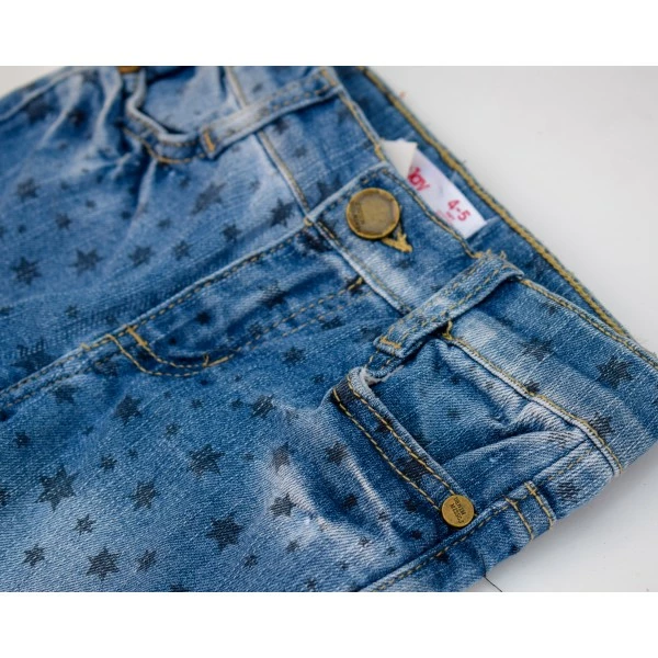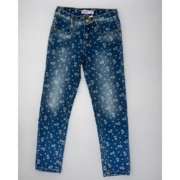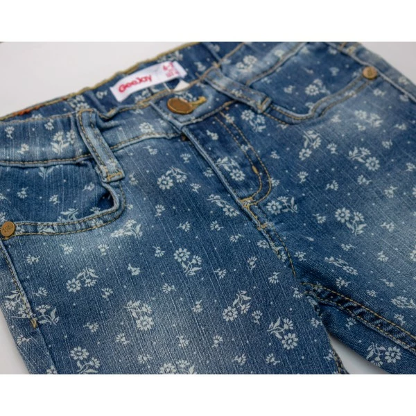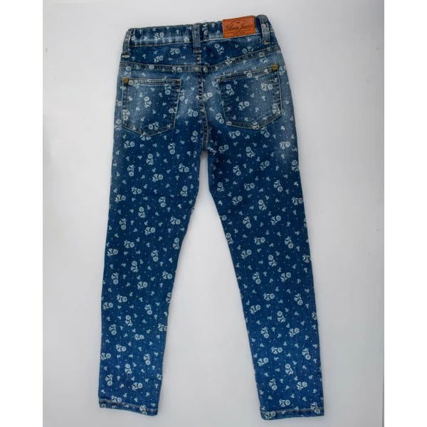 мелкий принт и эффект потертости придают джинсам стильный вид.