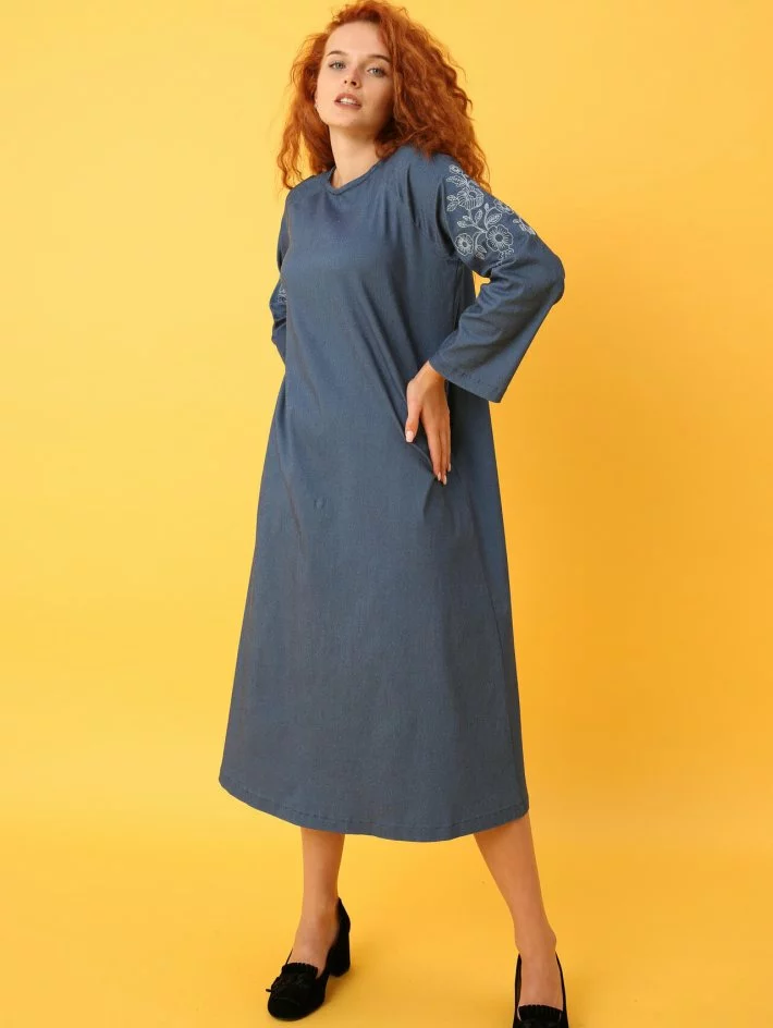 Сукня трапецоїдного крою з вишивкою на рукавах і змійкою по спинці.