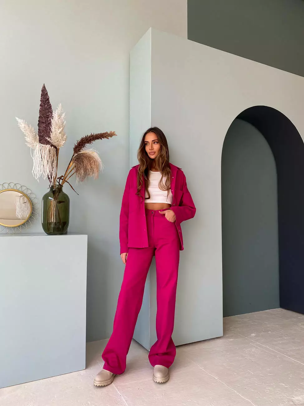 Сорочка подовжена та має дві накладні кишені, застібається на ґудзики, штани прямого крою та високої посадки.