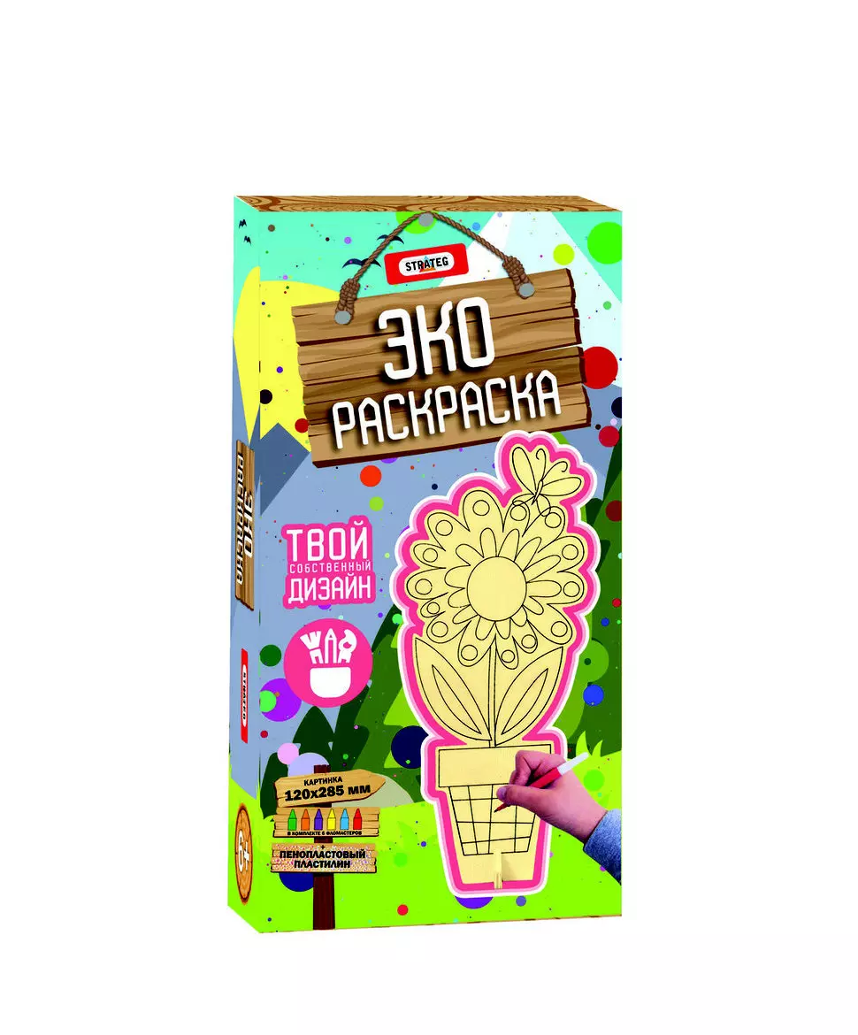 Вік: від 6-ти років Матеріал: картон Комплект: картина, 6 фломастерів, пінопластовий пластилін Розміри картини: 28.5 х 12 см Розмір упаковки: 32 x 12 x 3 см Розфарбування - це не тільки картина, але і весела і цікава історія, яку кожен малюк може створити сам за допомогою еко-розмальовки «Квіточка» (Стратег Арт.5003). Дитина сам зможе визначити, як буде виглядати первісна картинка в результаті його творчих зусиль, підібрати кольори, використовувати для прикраси різні матеріали. Сам процес допоможе малюкові поринути у світ фантазії, навчить концентрувати увагу, розрізняти і комбінувати кольори, привчить до акуратності і наполегливості в досягненні мети. Незайвим буде і фізичний розвиток - координація рухів і зусилля маленьких пальчиків при малюванні. Розфарбовування картинок стане не просто веселою розвагою, але і допоможе розвинути творчі здібності, впевненість в своїх силах і сформувати особистість дитини. У наборі не тільки кольорові фломастери, а й такий цікавий матеріал, як кольоровий пінопластовий пластилін - з його допомогою зображення придбає обсяг. Передбачено підставу, за допомогою якого фігурну картинку можна встановити вертикально. Готова картина з яскравим квіточкою стане прикрасою дитячої кімнати або незабутнім подарунком.
