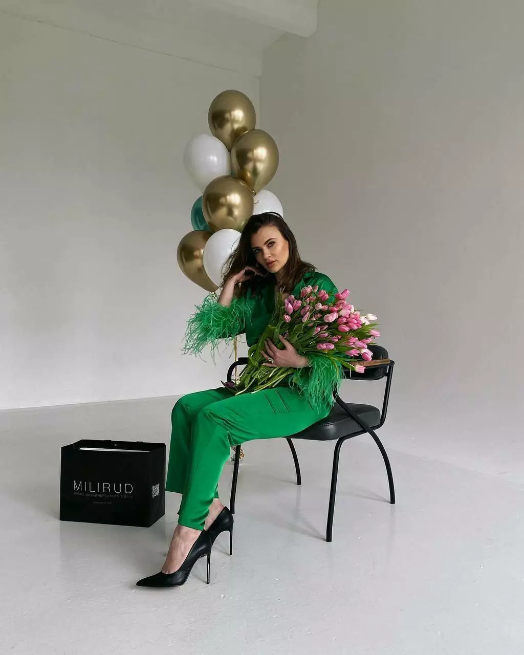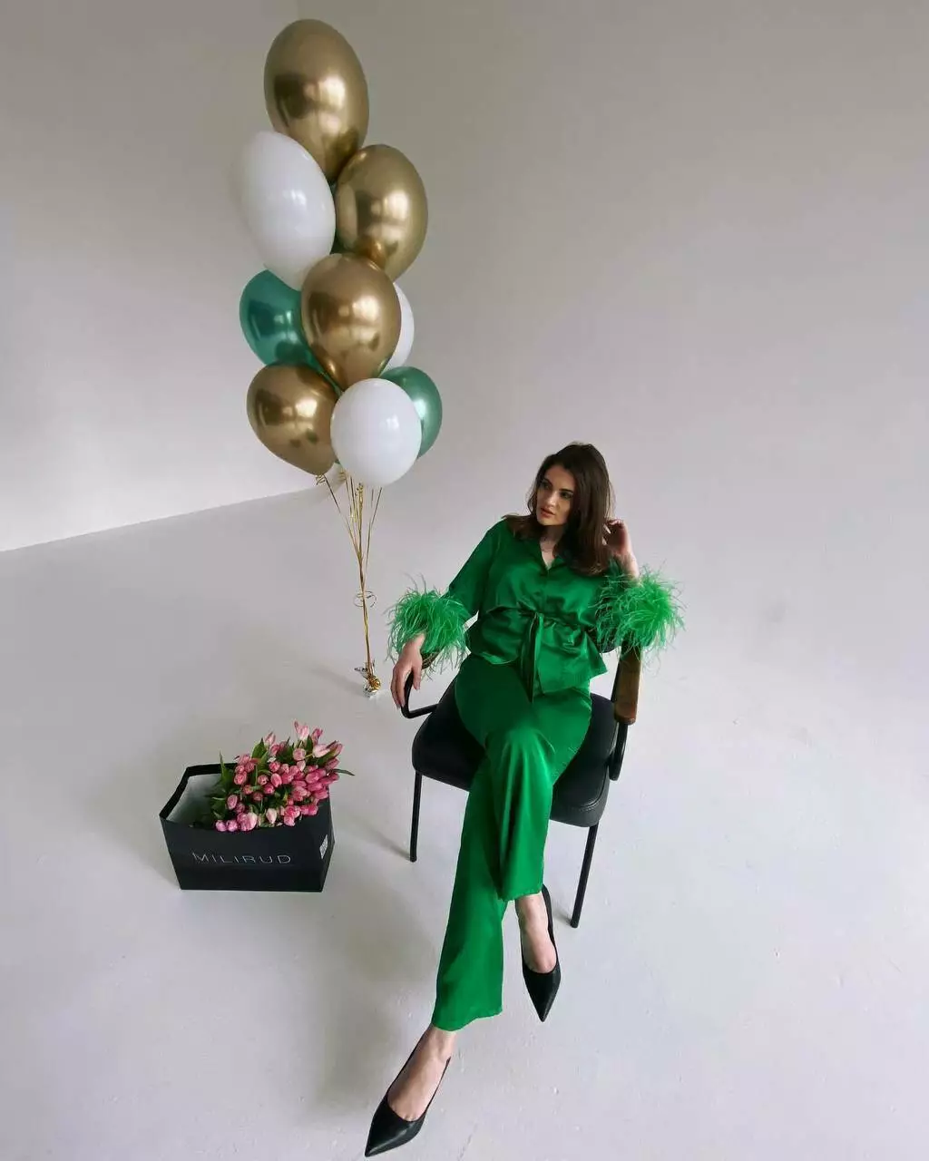 Елегантний костюм БОА декорований пір'ям зеленого кольору