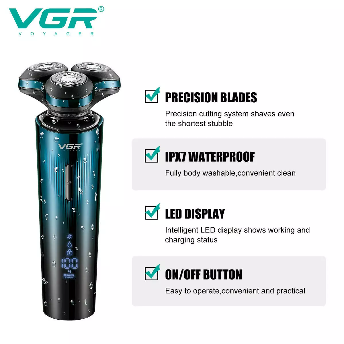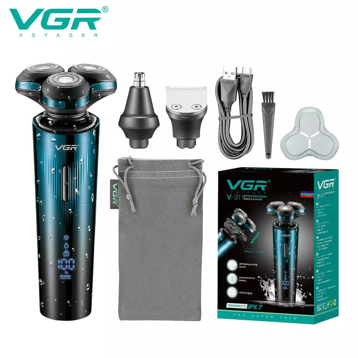 Електробритва VGR 3 в 1 V-303, 3 насадки, IPX7, LED display