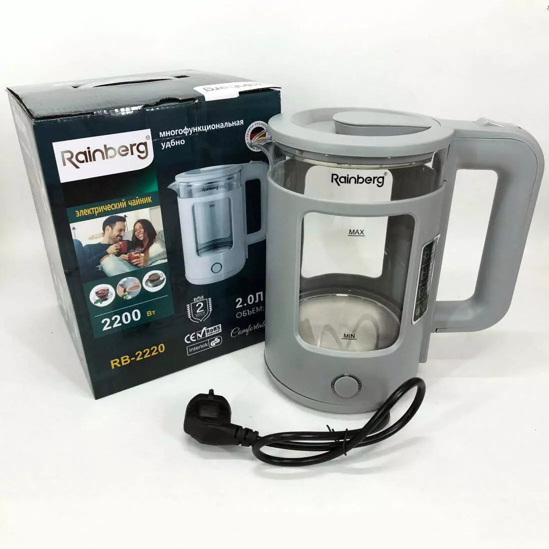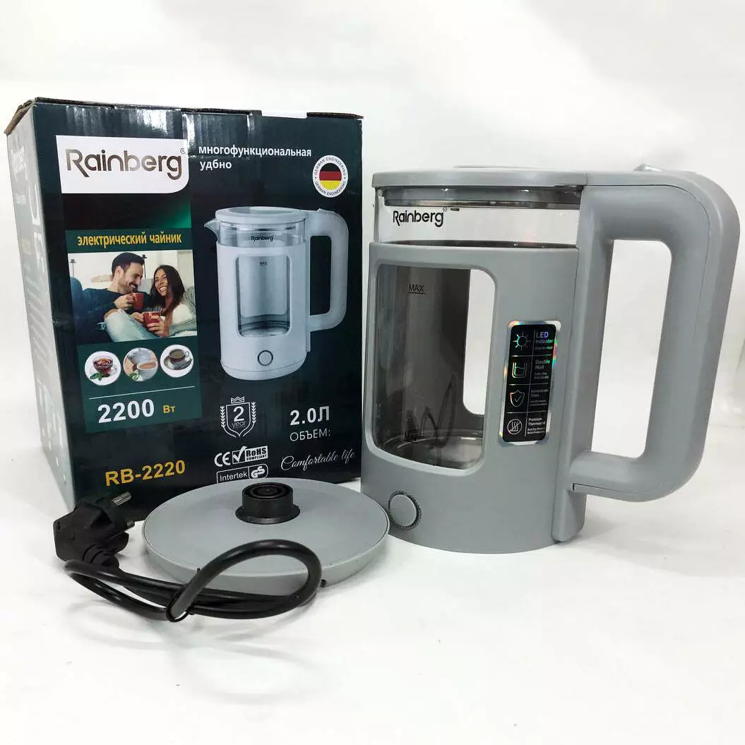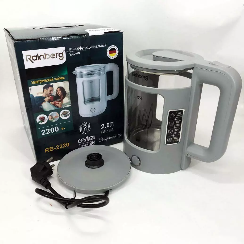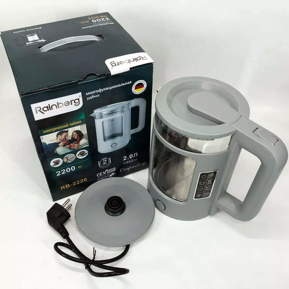 Электрочайник Rainberg RB-2220 стеклянный, дисковый прозрачный. Чайник с подсветкой 2200W. Цвет: серый