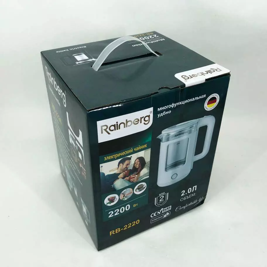Корпус электрочайника Rainberg RB-2220 изготовлен из стекла и пластика высокого качества. Чайник имеет удобную и обтекаемую форму ручки, на которой расположены кнопки вкл./выкл.