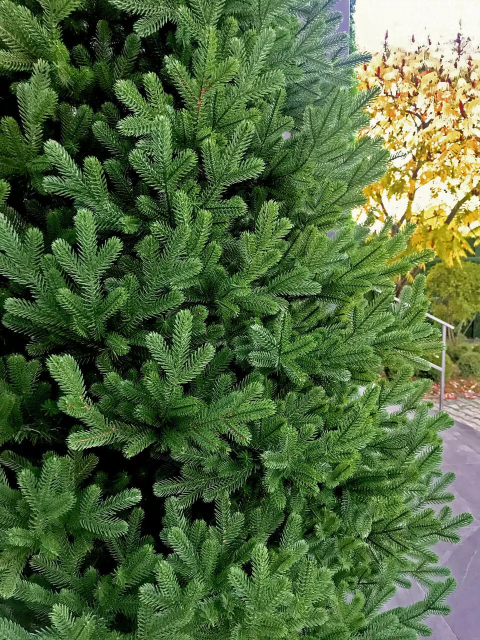 • Пышная и густая крона: Благодаря увеличенному количеству литых веток елка выглядит чрезвычайно объемной, а густота хвои скрывает ствол, придавая дереву эффект полноты и многослойности.
