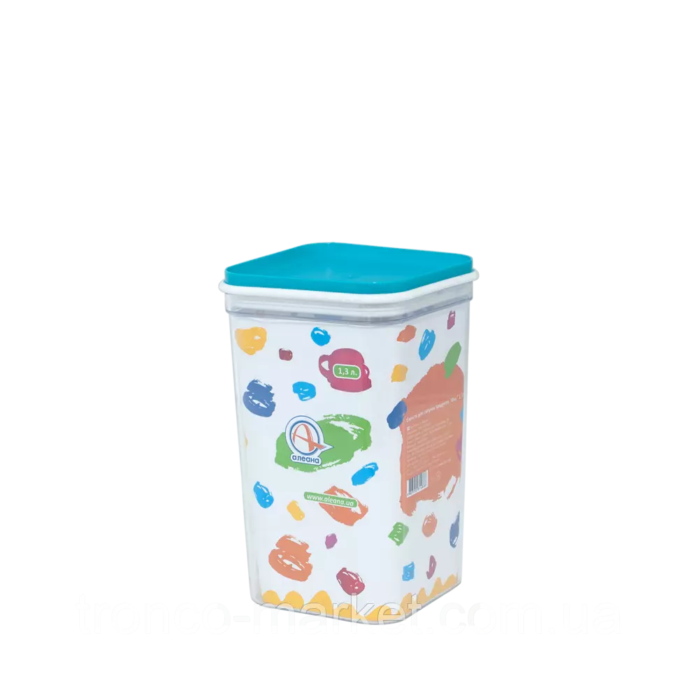Емкость для сыпучих продуктов "Фикс" 1,3л., Артикул 169059,  параметры изделия : линейные размеры ,мм : 110 х 110 х 190, объем - 1,3 л;  кол-во в упаковке: 25 шт.    Цвета  в ассортименте :_пр./бірюзова,_пр./кремова,_пр./оливкова,_пр./світло-оранжева,_пр./темно-рожева.