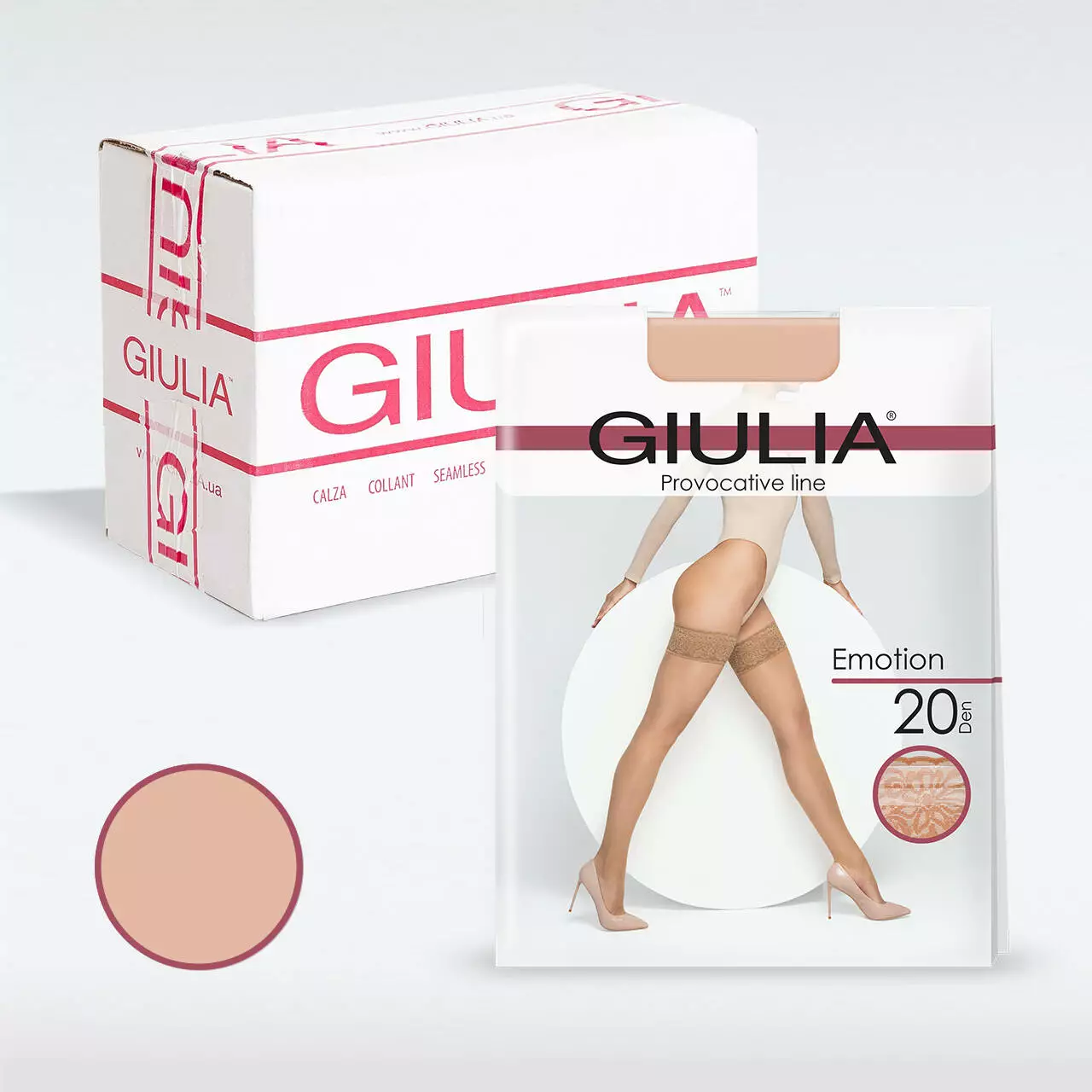 Шовковисті напівматові панчохи Giulia EMOTION 20 з елегантним самоутримувальним мереживом. Резинка прикрашена вишуканим ажурним мереживом з квітковими мотивами, що надає виробу особливий шарм. Її ширина становить 8 сантиметрів, забезпечуючи надійне утримання на нозі завдяки високоякісним силіконовим смужкам. Модель має шовковисте напівматове полотно щільністю 20 den,  надзвичайно еластичне і чудово облягає ніжки, створюючи вишуканий вигляд і забезпечуючи комфорт протягом дня.