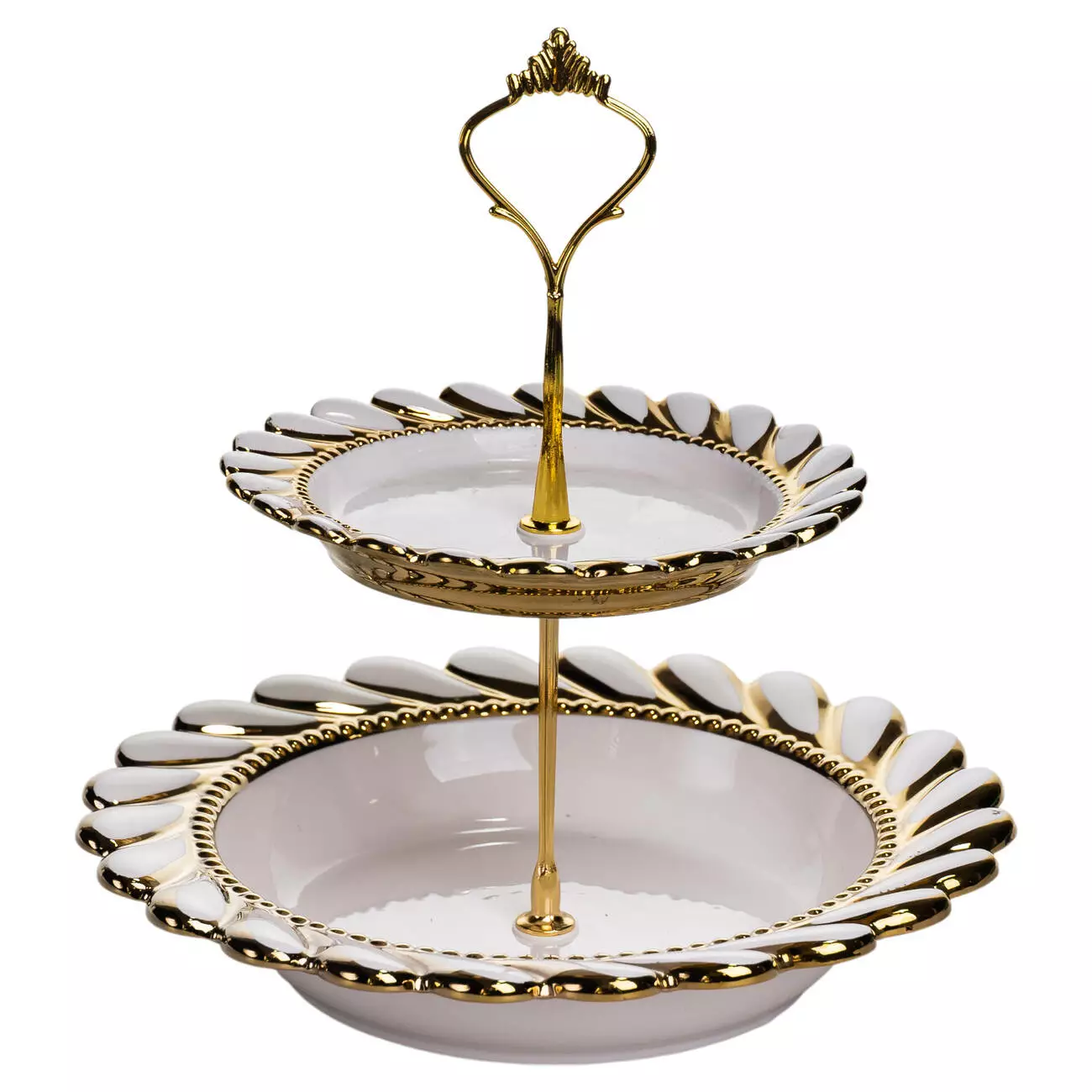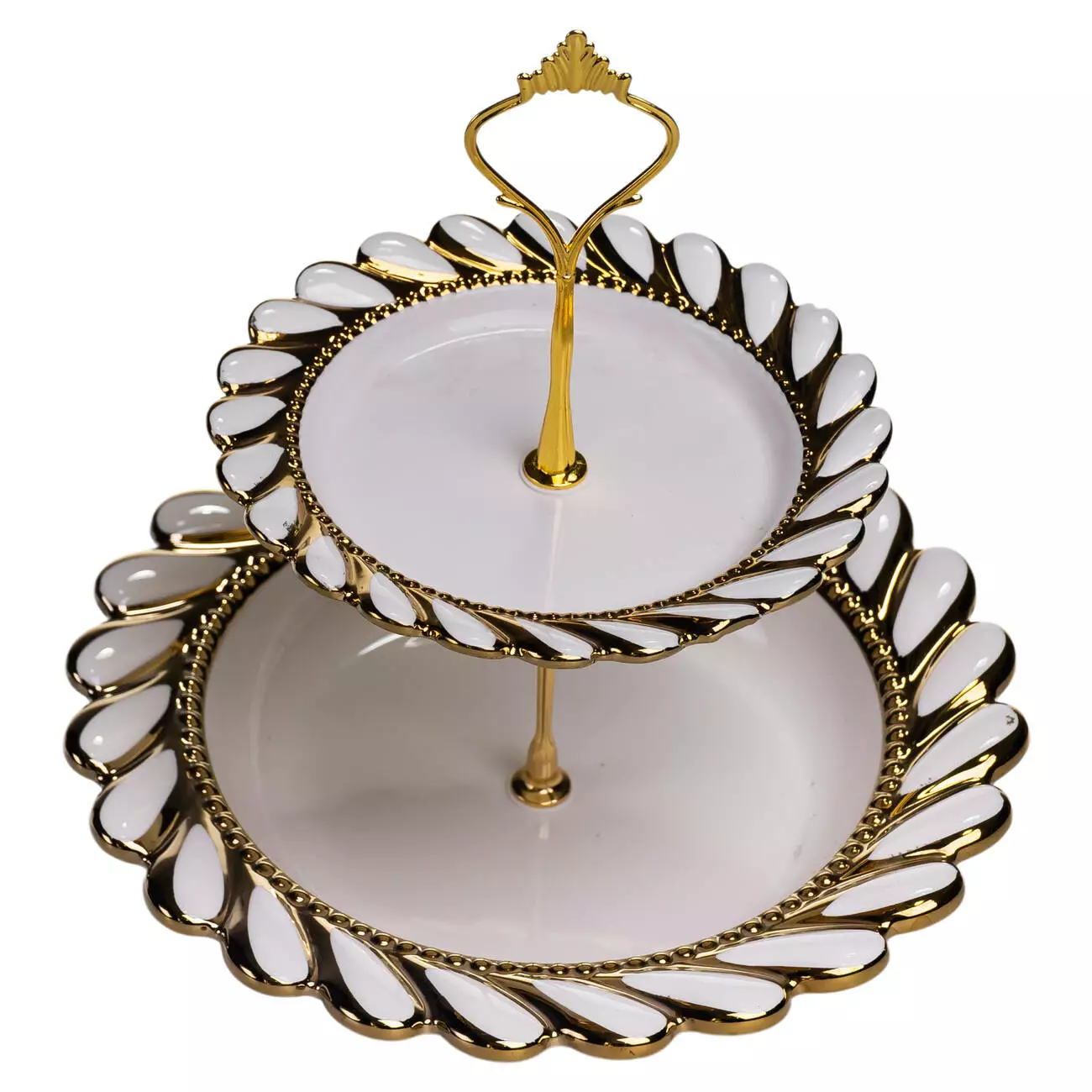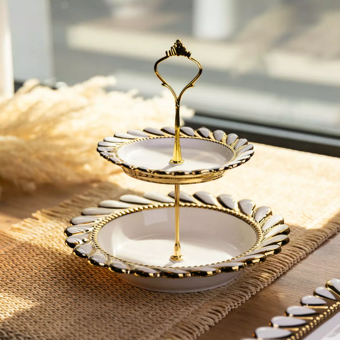 Тарілки виготовлені з порцеляни, що має гладку поверхню та не вбирає запахи. Кожен ярус має хвилястий край, який нагадує пелюстки квітки та формує виразний контур. Тонка золота окантовка по краю підкреслює форму тарілок і гармонійно поєднується з металевою основою, створюючи цілісний і збалансований вигляд конструкції.