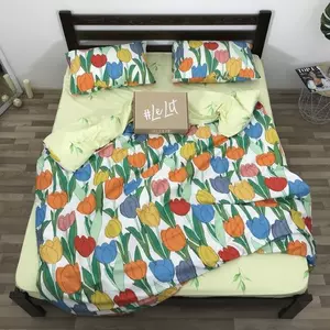 Евро постельное белье LeLIT 0777 салатное с принтом "Тюльпаны"