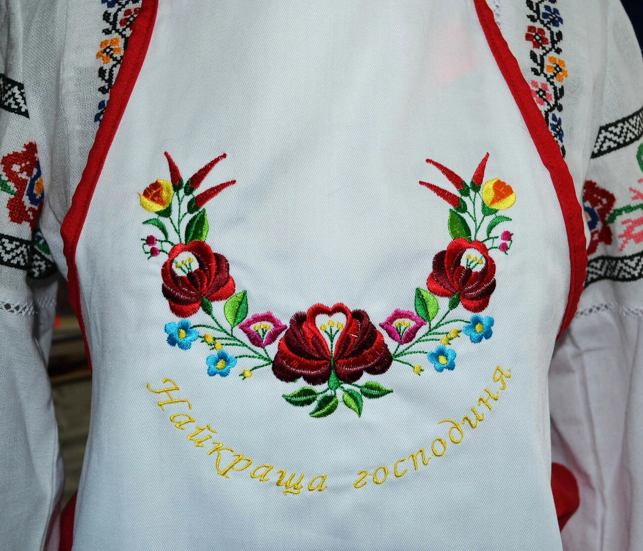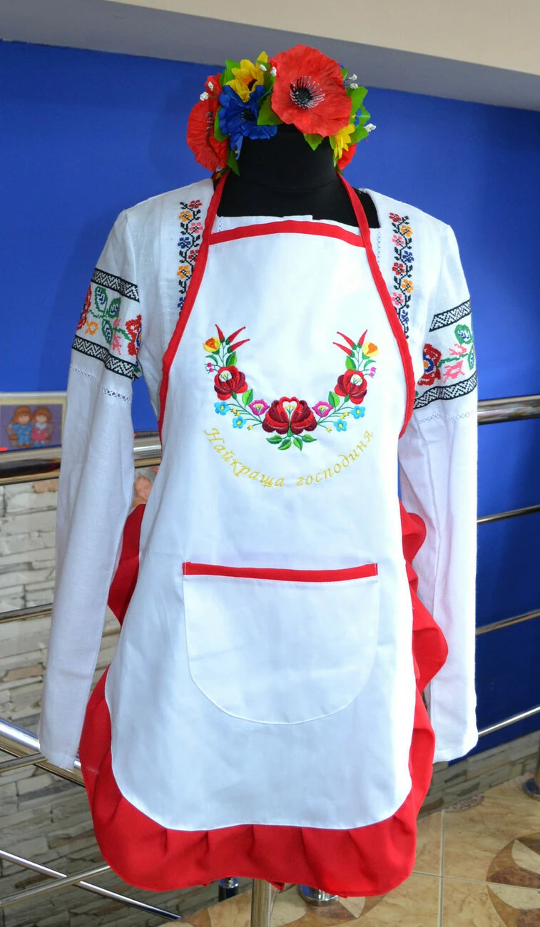 Яскраво-червоний фартух з оригінальним вишитим надписом