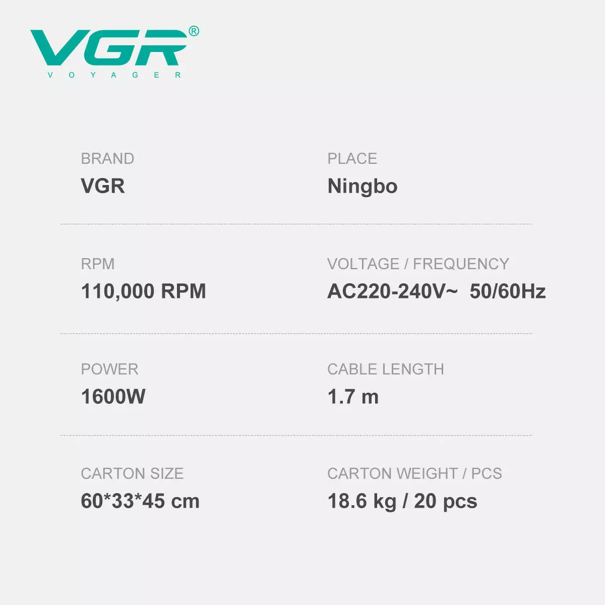 Фен VGR V‑445 з безщітковим мотором BLDC нового покоління поєднує потужність, функціональність і продуманий дизайн. Завдяки високій швидкості обертання двигуна – до 110000 об/хв – пристрій забезпечує інтенсивний потік повітря для швидкого та щадного сушіння волосся будь-якого типу.