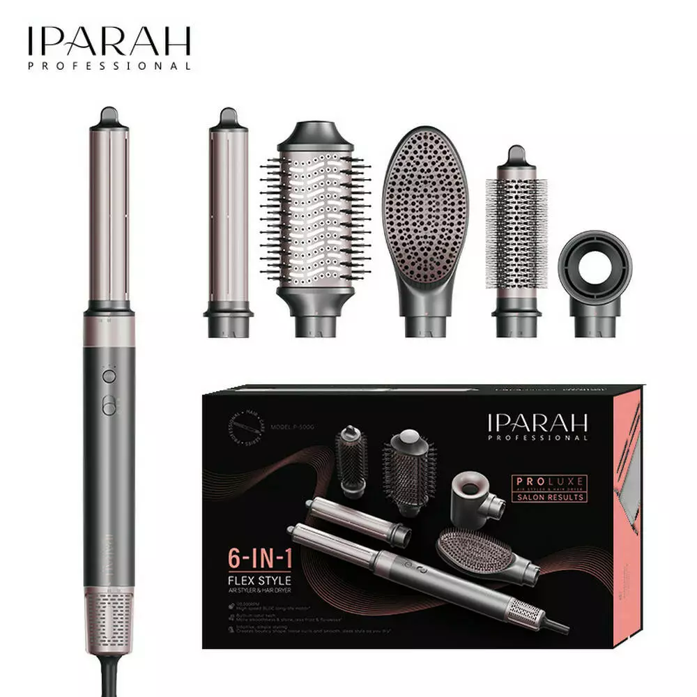 Багатофункціональний Hot Air Styler IPARAH P‑500 - це професійний прилад 6 в 1 для сушіння, укладання, завивки та випрямлення волосся. Оснащений високоефективним безщітковим мотором BLDC з високою швидкістю повітряного потоку, що забезпечує потужне, але дбайливе сушіння без пошкоджень і перегріву. Пристрій поєднує функції фена, браш-щітки, автоматичних стрижнів для завивки, круглої і овальної щіток для об'єму, а також щітки-випрямляча для гладкого і доглянутого волосся. Регульовані режими швидкості обдування та температури дозволяють підібрати оптимальні параметри для будь-якого типу волосся, а технологія негативної іонізації знижує статичну електрику, надаючи зачісці блиску та м'якості. Ергономічний дизайн і насадки, що легко змінюються, роблять цей стайлер ідеальним як для повсякденного використання будинку, так і для професійного застосування в салоні.
