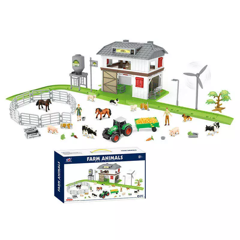 Ферма Q 9899 ZJ82 (12) 117 елементів, двоповерховий хлів, огорожі, траса, зернотерка, вітряк, фігурки людей і тварин, металопласт. трактор, в коробці