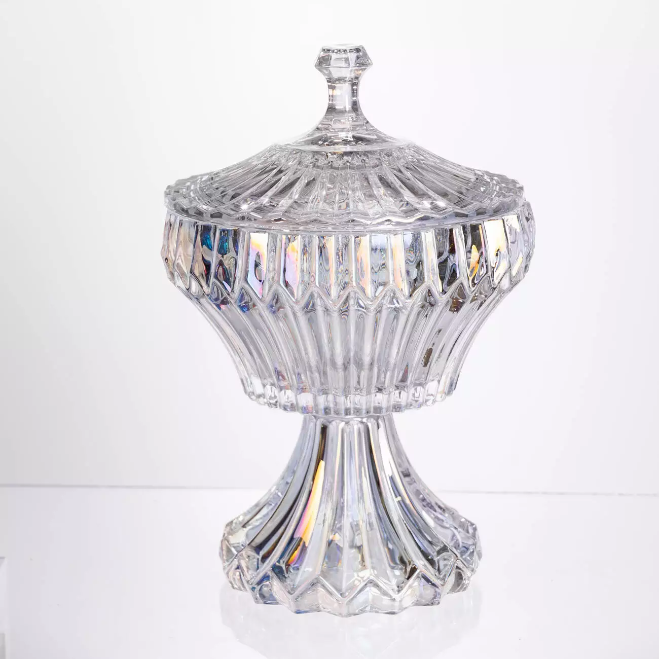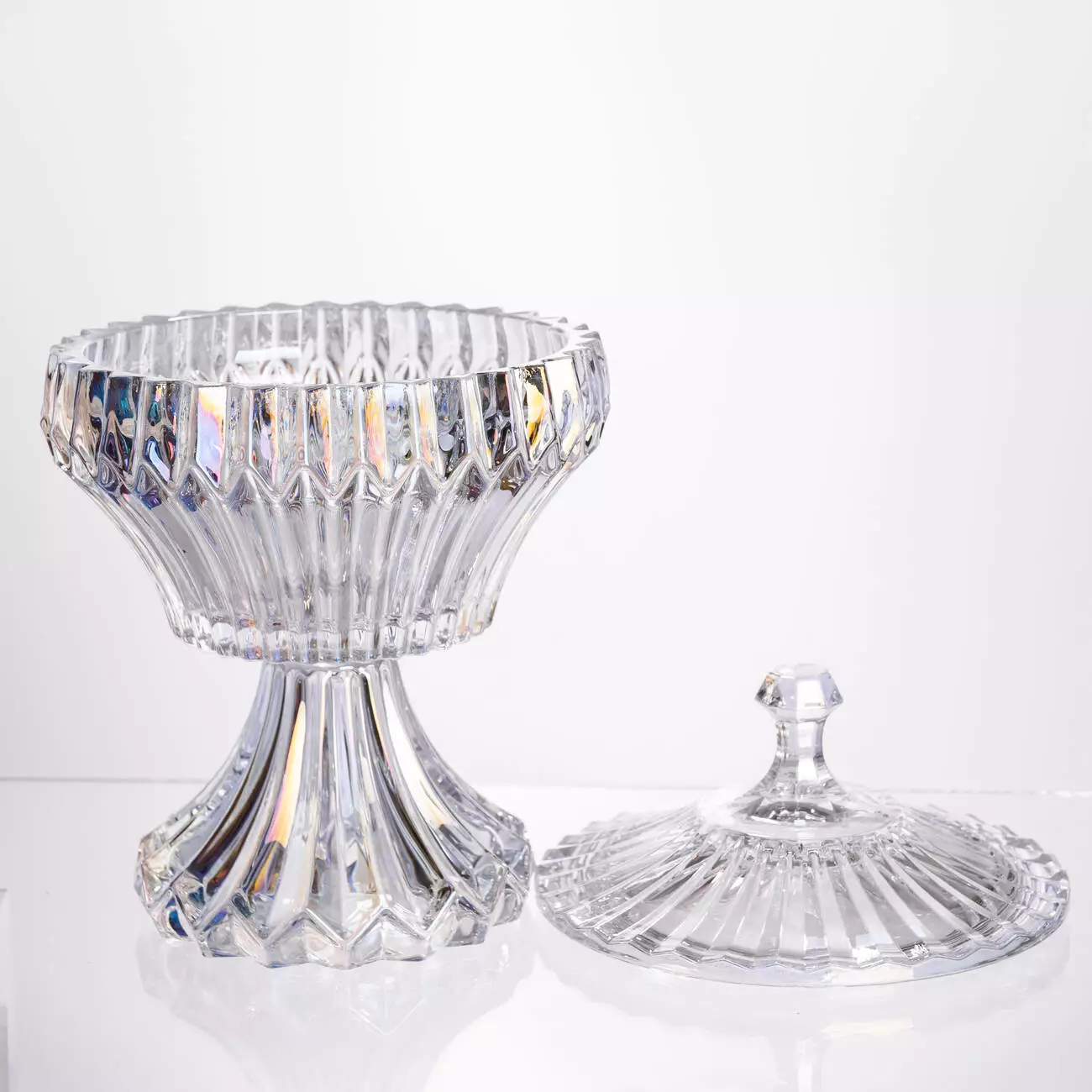 Цукерниця на ніжці Lotus виготовлена з прозорого кришталевого скла, що забезпечує чітку видимість вмісту та створює характерний блиск. Виріб призначений для подачі цукерок або випічки, а завдяки наявності кришки вміст залишається захищеним від пилу та зовнішнього впливу. Скло не вбирає запахів і легко очищується після використання.