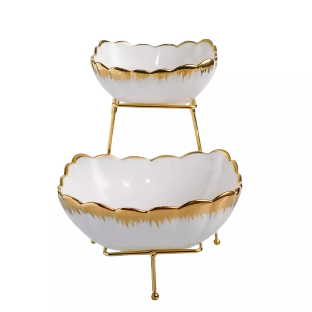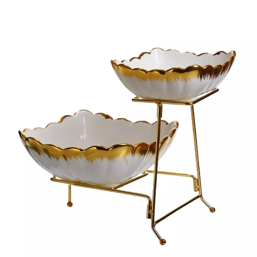 Чаші встановлені на металевій підставці з трьома опорними ніжками, що забезпечують стійкість конструкції. Верхній ярус піднятий над нижнім, що створює багаторівневу композицію для сервірування. Плавний перехід кольору на порцеляні та хвилясті краї додають виробу декоративної виразності без надмірностей.