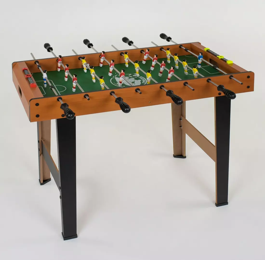 Підлоговий футбол – це цікава захоплююча гра, яка сподобається не лише дітям, а й дорослим. Влаштовуйте справжні спортивні матчі прямо у себе в кімнаті з футболом 1090, Дерев'яний стіл обладнаний 8-ма рухомими штирями та призначений для двох гравців. На кожному штирі встановлено фігурки гравців. У кожній команді по 11 гравців. Завдання гри таке саме, як і у справжньому футболі – головне не дати супротивникам забити гол у ваші ворота! Пересуваючи та обертаючи штирі, гравці переміщатимуть м'яч по підлозі. Передаючи паси тій чи іншій фігурці, гравці забезпечать собі та тим, хто спостерігає реалістичну гру. З обох боків столу для кожного гравця встановлені лічильники, за допомогою яких вони підбиватимуть підсумки, вважаючи забиті голи. З підлоговим футболом дитина відчує дух суперництва, навчиться приймати перемоги та поразки і просто весело та захоплююче проведе час.