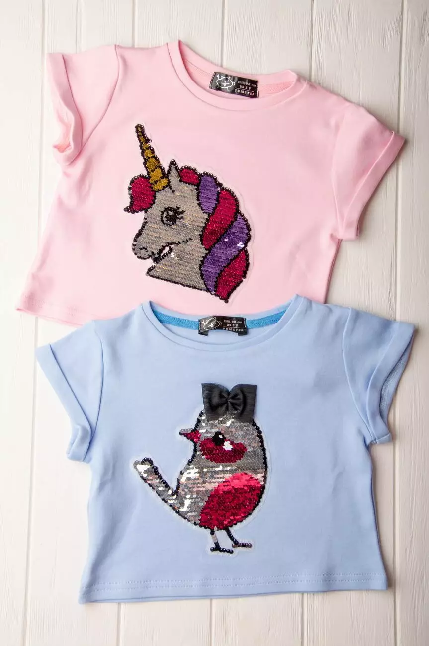 Стильна дитяча футболка з аплікацією - перевертишем з паєток.