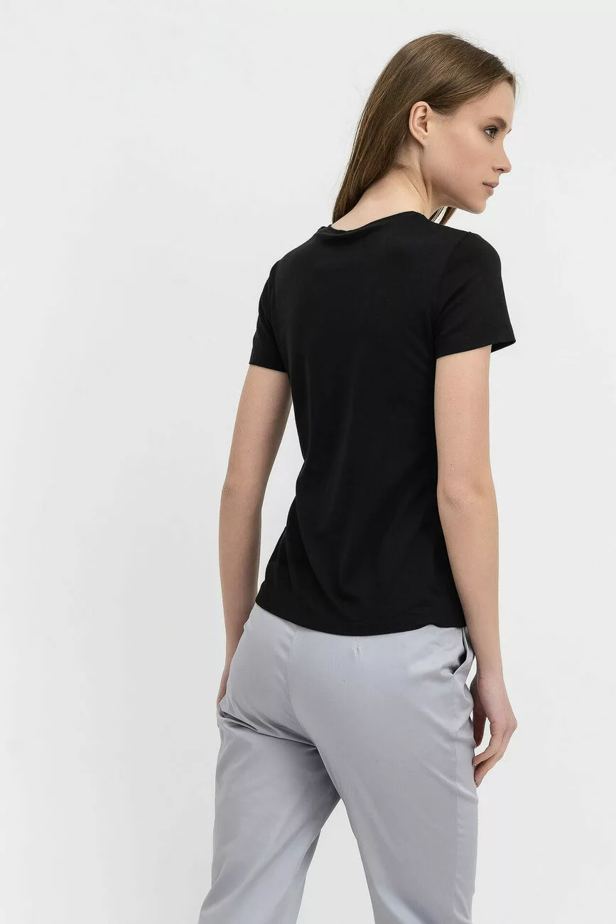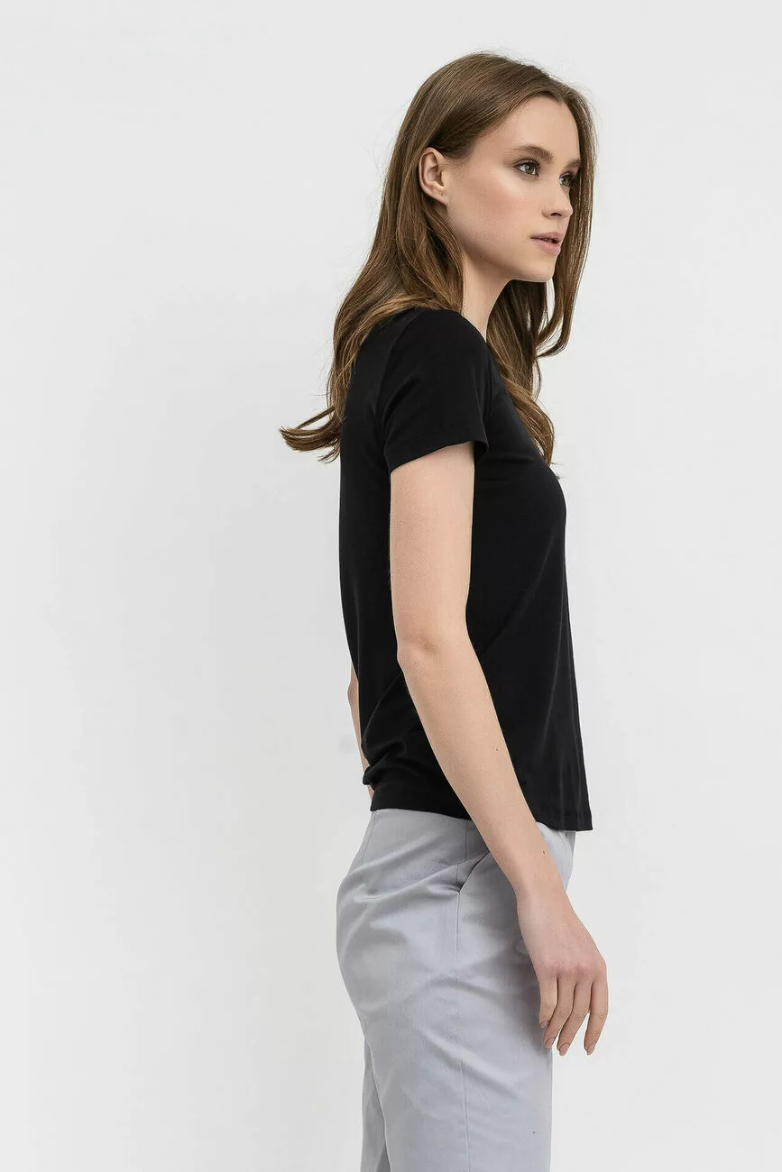 Класична футболка чорного кольору з круглою горловиною. Має вшивний
