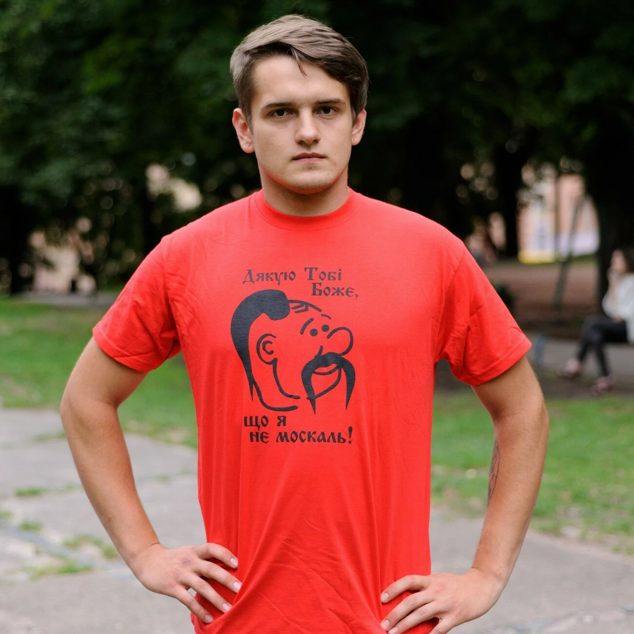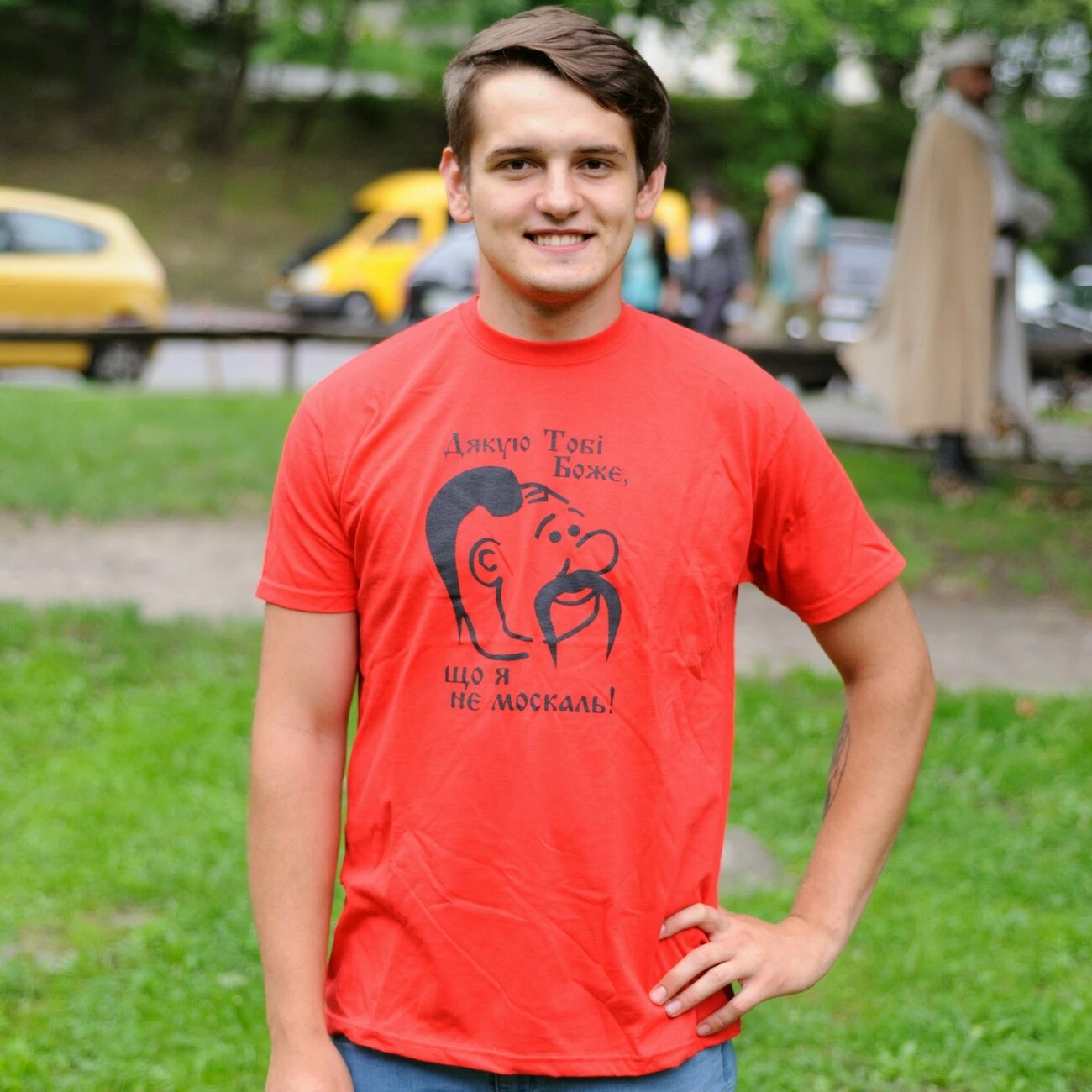 Чоловіча футболка із яскравим принтованим  зображенням та надписом на кольровому тлі від гуртівні Leosouvenir зробить Вас справжнім Українцем.