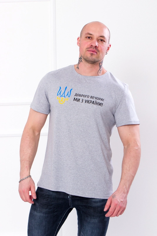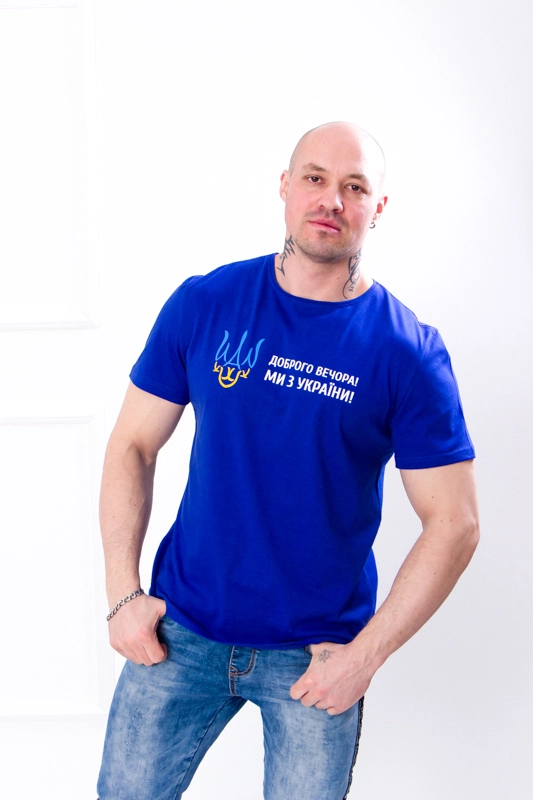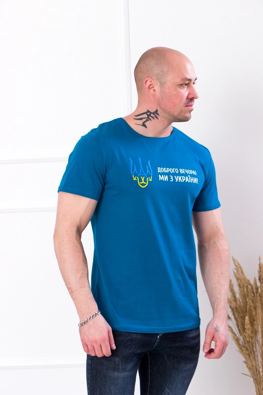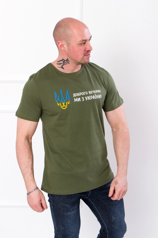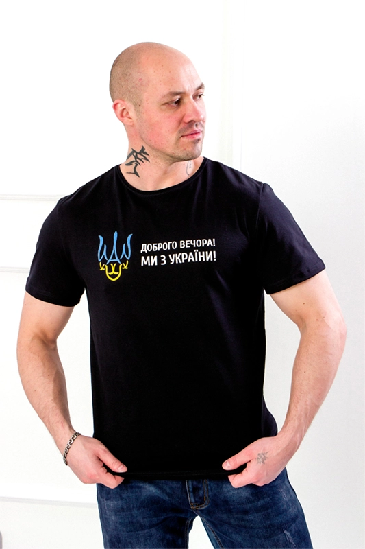 Футболка мужская "Украина" Доступен в следующих цветах: Ми з України! (капучино), Ми з України! (серый), Ми з України! (т. горчица), Ми з України! (тем.бирюза), Ми з України! (хаки), Ми з України! (чер.-синий), Ми з України! (черный), Ми з України! (электрик)