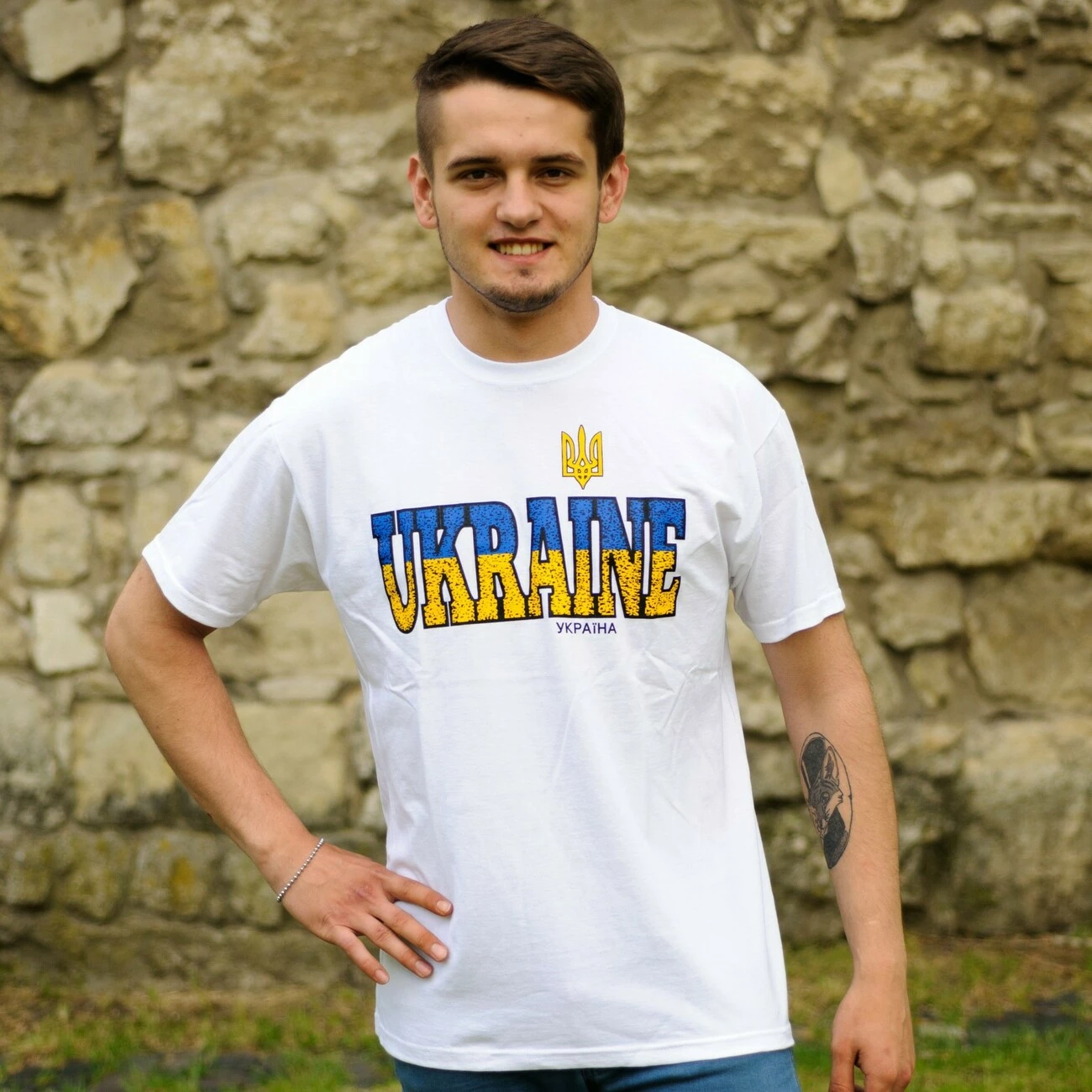 Чоловіча футболка із патріотичним принтованим надписом на кольоровому тлі від гуртівні Leosouvenir зробить Вас справжнім Українцем.