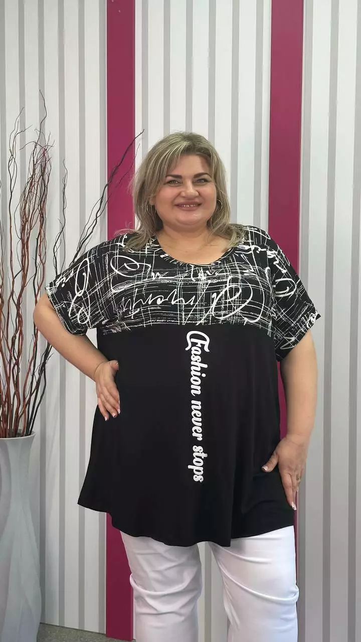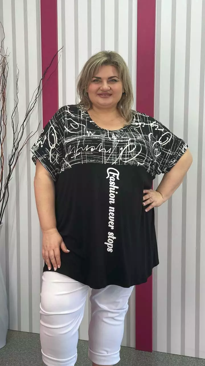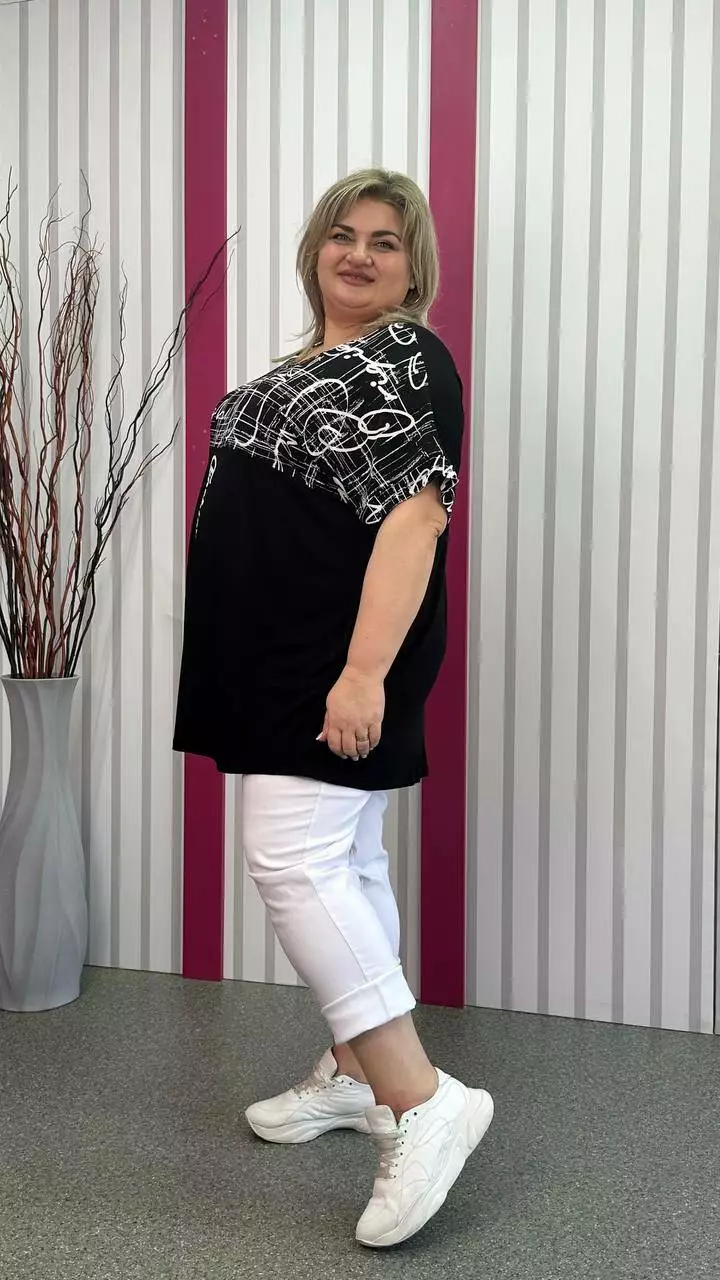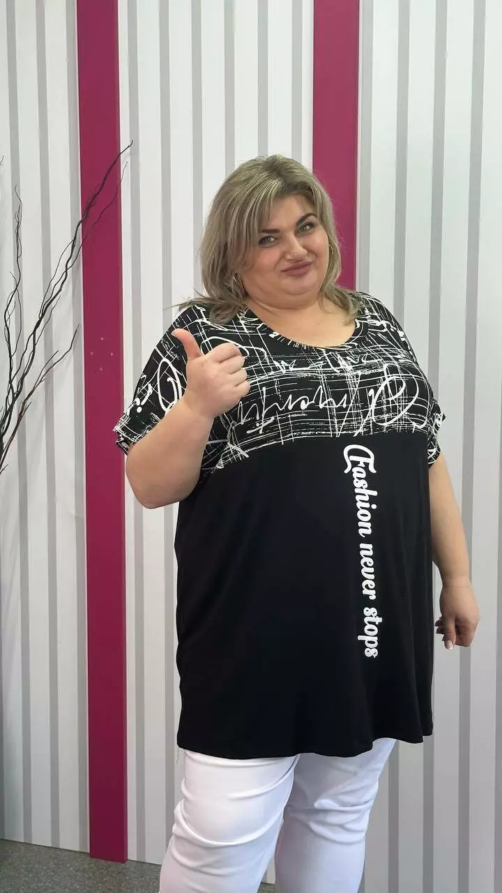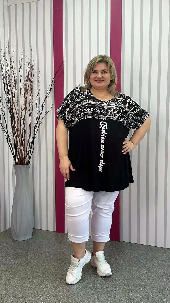 Футболка з турецької віскози відмінної якості з дуже гарною розтяжністю, комбінована з корейською олією та прикрашена якісним накатом. Силует трапеція, зі спущеним плечем, по грудях оверсайз. Дуже приємна до тіла, не жарка.