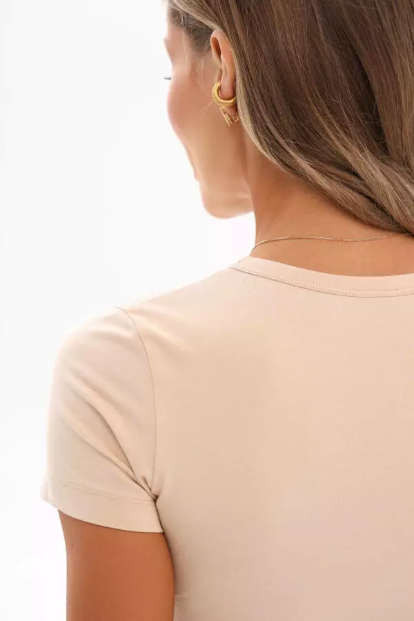 Футболка жіноча із куліру в бежевому кольорі – це базова річ гардероба, яка поєднує комфорт і універсальність. М’яка натуральна тканина приємна до тіла, добре пропускає повітря та забезпечує зручність протягом усього дня. Лаконічний фасон легко вписується як у повсякденні образи, так і у домашній або базовий лук. У цій колекції також представлені майка, бойшортс та труси бріфи – створіть свій ідеальний комплект у стилі мінімалізму