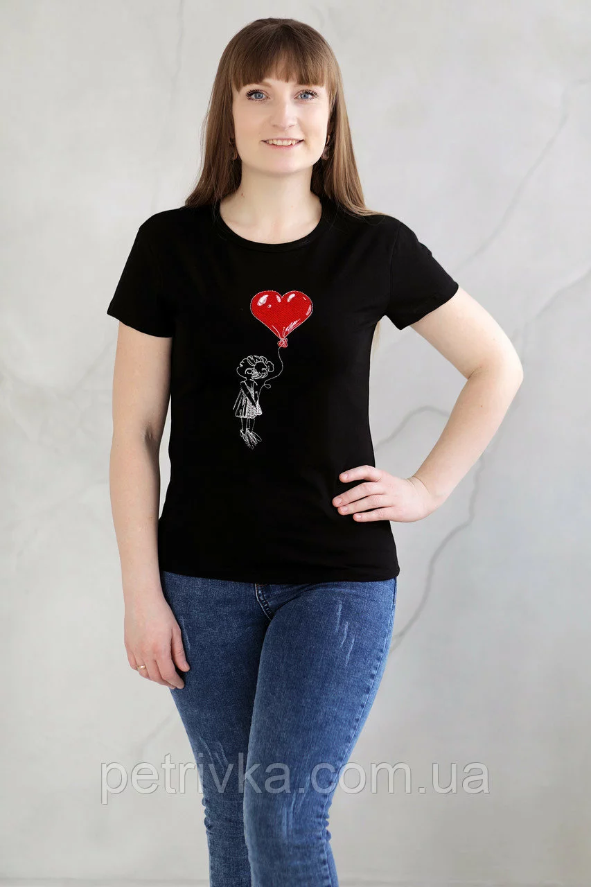 Жіноча Чорна футболка в стилі CASUAL, з вишитим принтом Дівчинка з