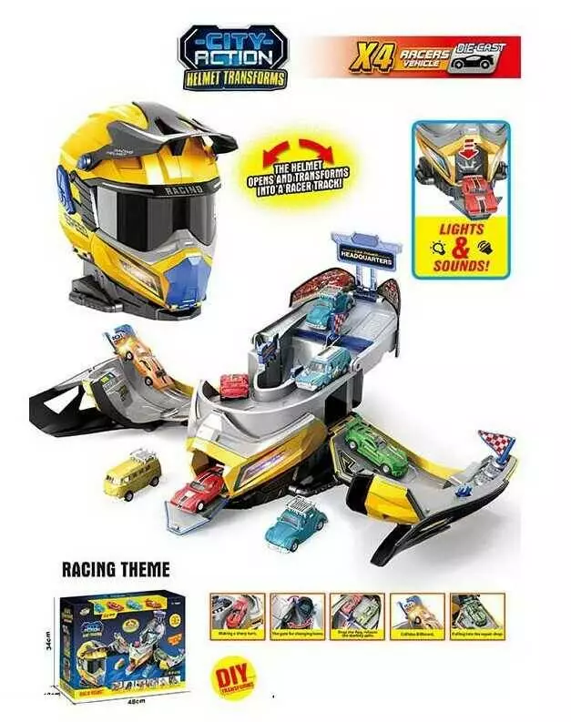 Головна > Каталог > Іграшки > Автотреки, гаражі > Трек SK 637 SA (12) звуки, підсвічування, рухливі елементи, складається у шолом, 4 металопластикові машинки, в коробці оптом