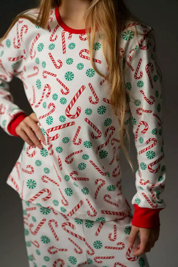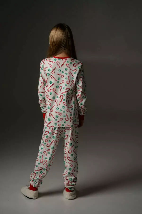 Дитяча піжама Candy Cane створена з м’якого бавовняного трикотажу, який забезпечує комфорт і тепло протягом усього сну. Натуральна тканина приємна до тіла, добре пропускає повітря та не викликає подразнень, що робить її ідеальною для дитячої шкіри. Комплект складається з кофти з довгим рукавом і штанів із манжетами, які зручно прилягають і не обмежують рухів. Святковий принт із цукровими тростинками створює затишну новорічну атмосферу. Піжама доступна також у форматі family look – є варіанти для дітей і дорослих, щоб уся родина могла виглядати гармонійно та святково