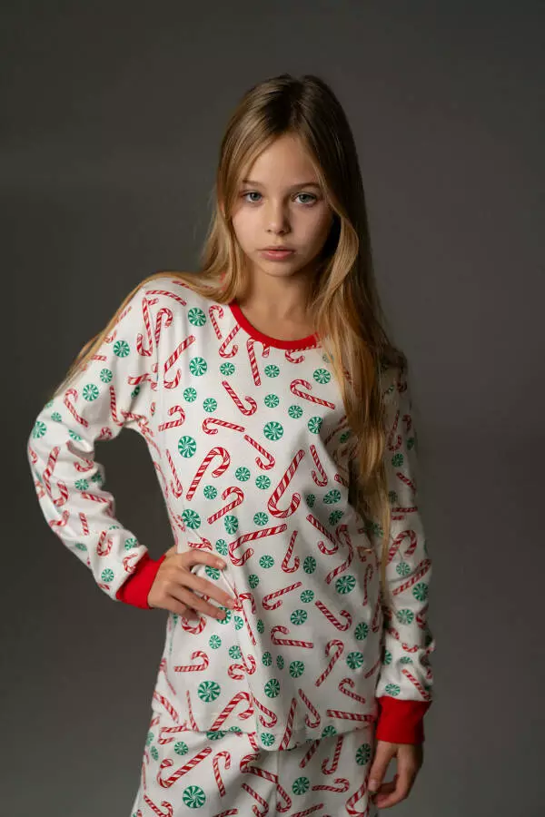Дитяча піжама Candy Cane створена з м’якого бавовняного трикотажу, який забезпечує комфорт і тепло протягом усього сну. Натуральна тканина приємна до тіла, добре пропускає повітря та не викликає подразнень, що робить її ідеальною для дитячої шкіри. Комплект складається з кофти з довгим рукавом і штанів із манжетами, які зручно прилягають і не обмежують рухів. Святковий принт із цукровими тростинками створює затишну новорічну атмосферу. Піжама доступна також у форматі family look – є варіанти для дітей і дорослих, щоб уся родина могла виглядати гармонійно та святково