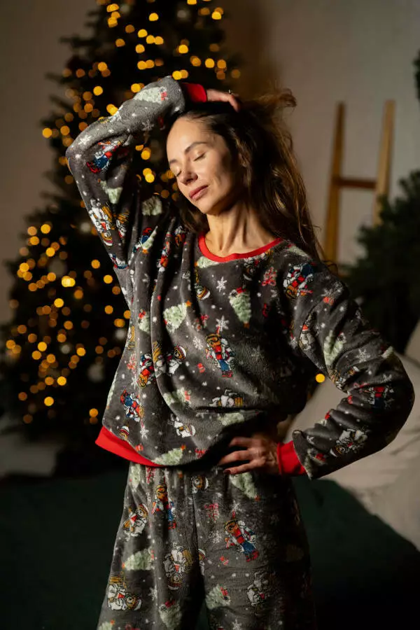 Піжамний костюм із м’якого велсофту з новорічним принтом створений для максимального комфорту та затишку. Комплект складається зі світшота вільного крою та штанів на резинці з манжетами. Манжети на рукавах і штанах, а також комір світшота виконані у червоному кольорі, що додає святкового настрою. Теплий і приємний до тіла матеріал добре зберігає форму, не викликає подразнення та легко переться. Сірий фон із зимовими малюнками сніговиків, ялинок і сніжинок створює атмосферу домашнього тепла та святкового комфорту – ідеальний вибір для зимових вечорів і новорічного відпочинку
