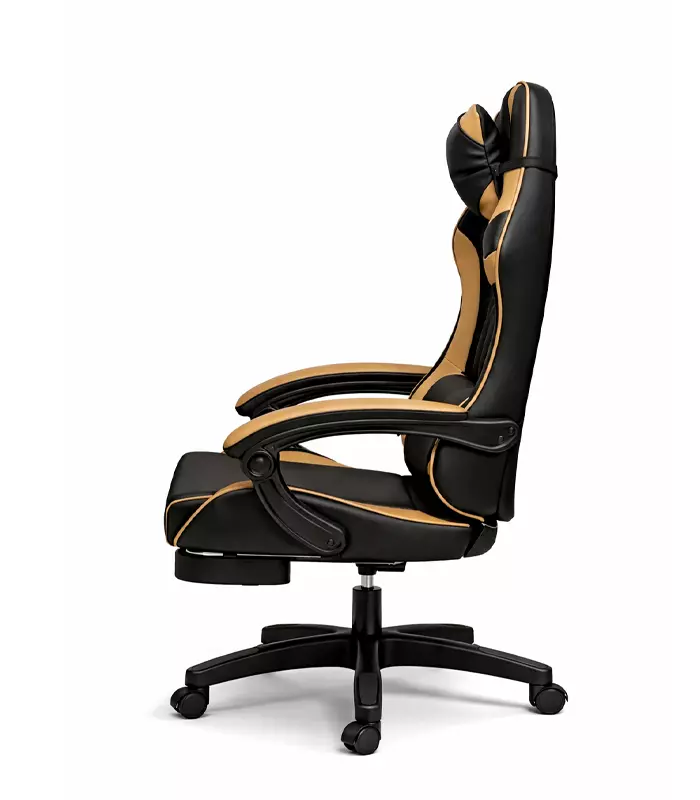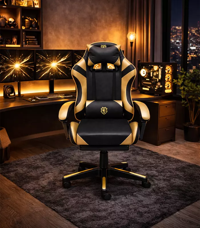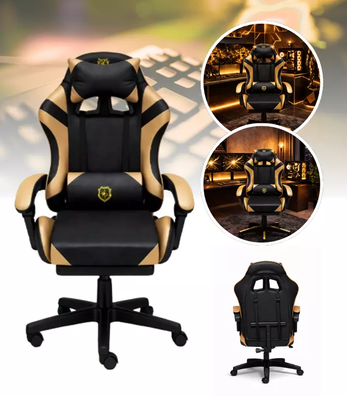 Геймерське крісло Primaveo з ергономічними подушками та висувною підставкою для ніг, Чорний/Золотий