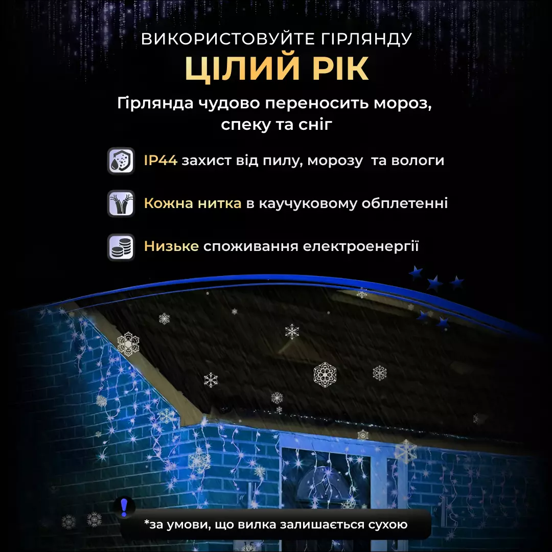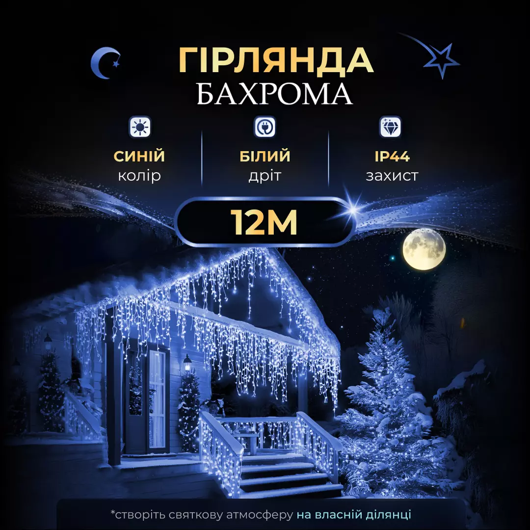 Гірлянда «Бахрома» з 200 LED лампочками створює атмосферне освітлення для зовнішнього або внутрішнього декору. Довжина основного шнура становить 12 метрів, що дозволяє прикрашати фасади будинків, вікна, балкони, альтанки чи вітрини. Завдяки білій нитці гірлянда непомітна вдень і виглядає акуратно при монтажі, а в темний час доби рівномірно розсіює світло, створюючи святкову ілюмінацію.