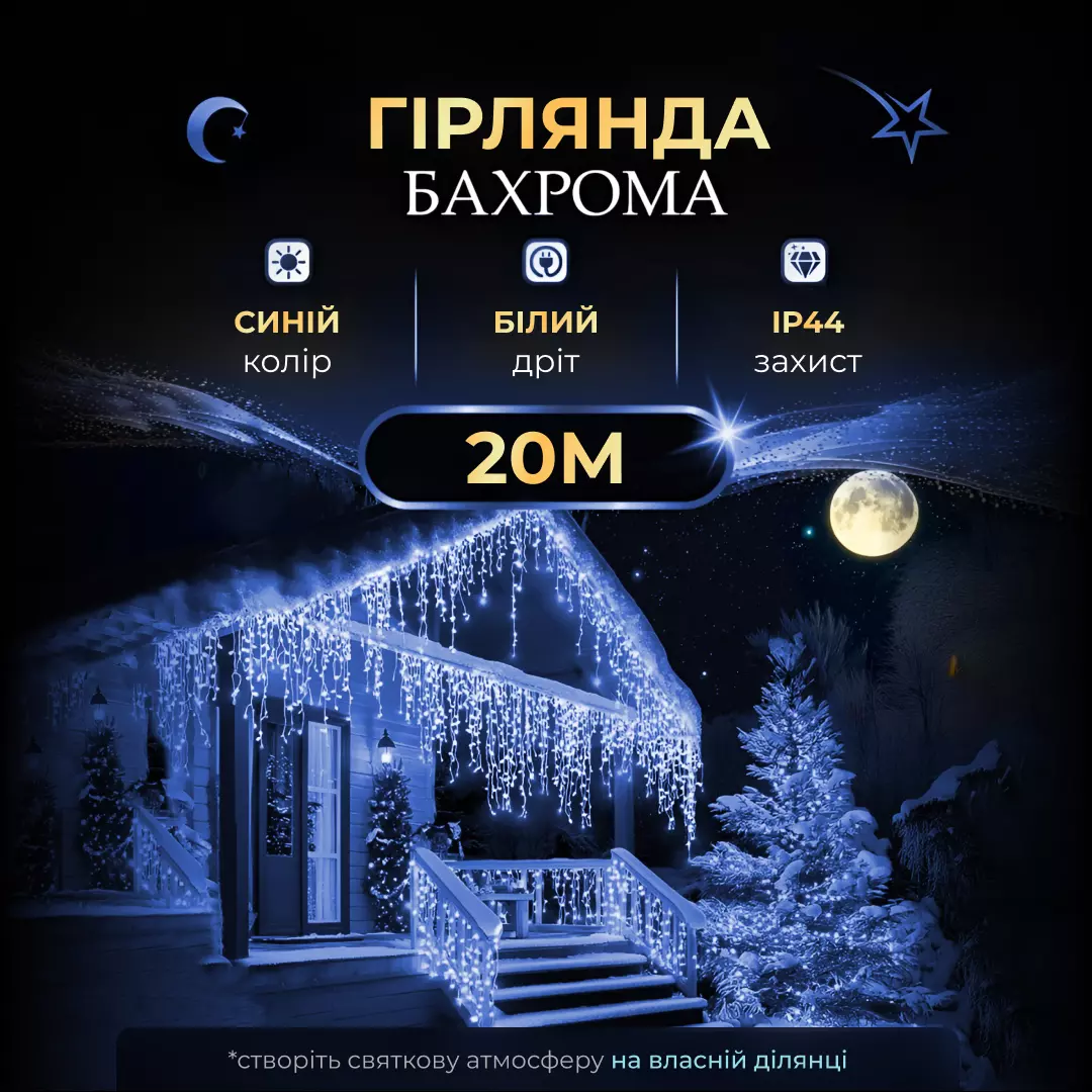 Гірлянда «Бахрома» з 335 LED лампочками створює атмосферне освітлення для зовнішнього або внутрішнього декору. Довжина основного шнура становить 20 метрів, що дозволяє прикрашати фасади будинків, вікна, балкони, альтанки чи вітрини. Завдяки білій нитці гірлянда непомітна вдень і виглядає акуратно при монтажі, а в темний час доби рівномірно розсіює світло, створюючи святкову ілюмінацію.