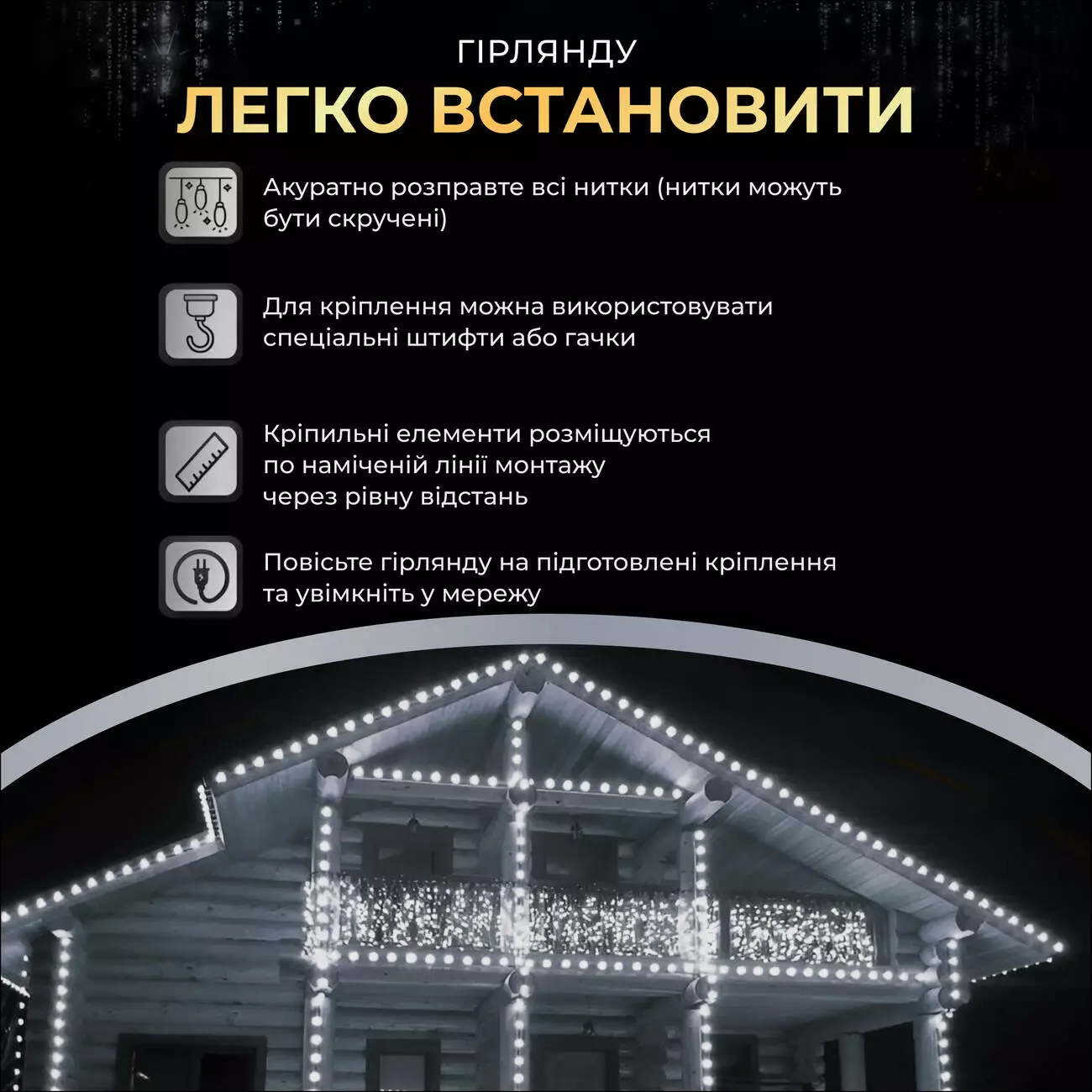 Гірлянда «Бахрома» з 405 LED лампочками створює атмосферне освітлення для зовнішнього або внутрішнього декору. Довжина основного шнура становить 25 метрів, що дозволяє прикрашати фасади будинків, вікна, балкони, альтанки чи вітрини. Завдяки чорній нитці гірлянда непомітна вдень і виглядає акуратно при монтажі, а в темний час доби рівномірно розсіює світло, створюючи святкову ілюмінацію.