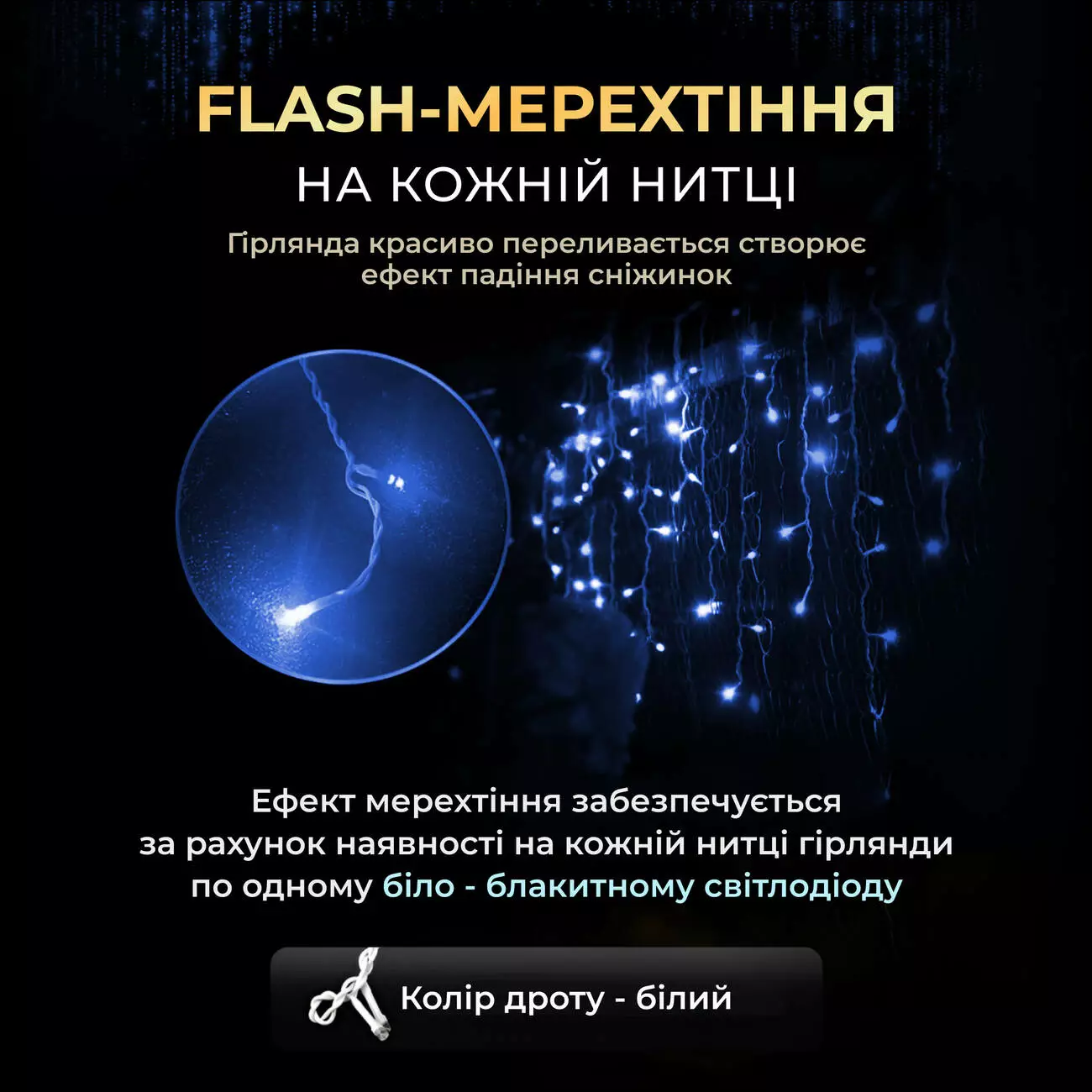Гірлянда «Бахрома» з 840 LED лампочками створює атмосферне освітлення для зовнішнього або внутрішнього декору. Довжина основного шнура становить 50 метрів, що дозволяє прикрашати фасади будинків, вікна, балкони, альтанки чи вітрини. Завдяки білій нитці гірлянда непомітна вдень і виглядає акуратно при монтажі, а в темний час доби рівномірно розсіює світло, створюючи святкову ілюмінацію.