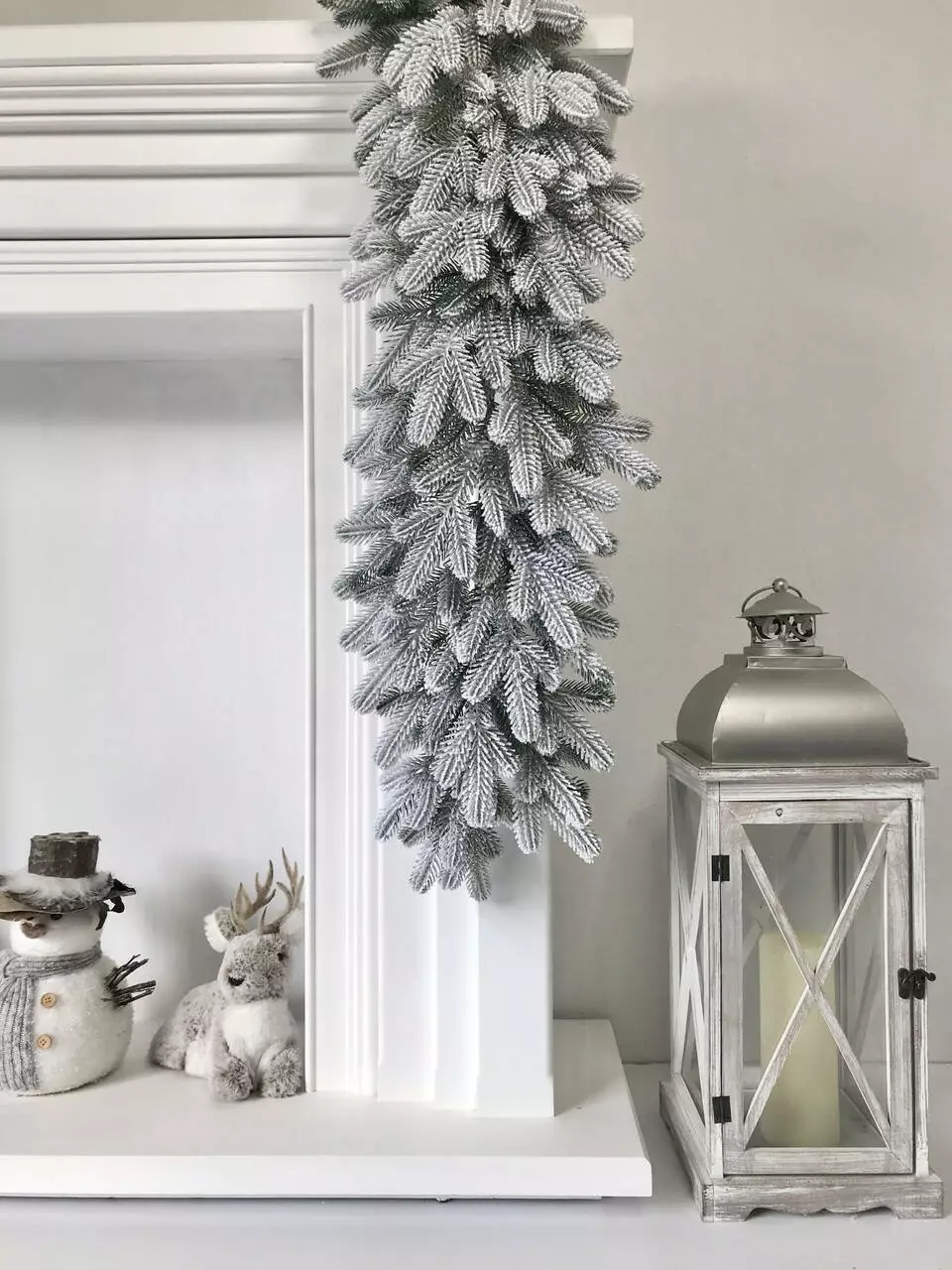 Хвойная гирлянда изготовлена путём переплетения искусственных еловых веточек.  Все ветки и иголочки - 100% литые, они выглядят, как хвоя живой ёлки, но более мягкие и не колючие. Объемное густое напыление реалистично имитирует снег, только что упавший на ветки пушистыми хлопьями. Материалом распыления является натуральный хлопок, он экологичен и не имеет запаха, безопасен для детей и взрослых.