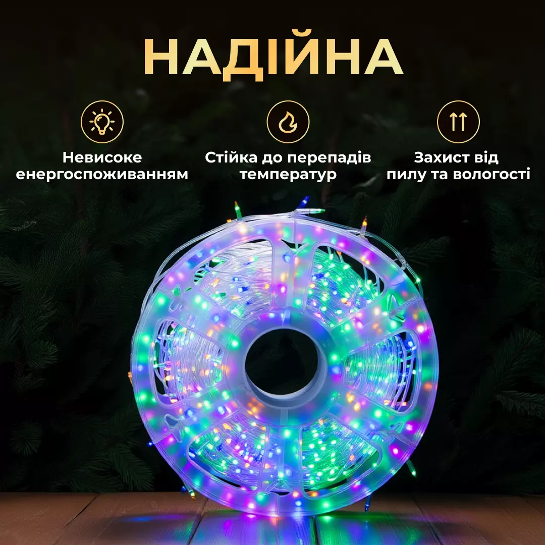 Нитка оснащена 1500 LED-діодами, які забезпечують м’яке, рівномірне світло. Світлодіоди енергоощадні, довговічні та безпечні у використанні. Довжина кабелю від вилки до першого діода становить 1 метр, що дозволяє зручно підключати гірлянду навіть у важкодоступних місцях.